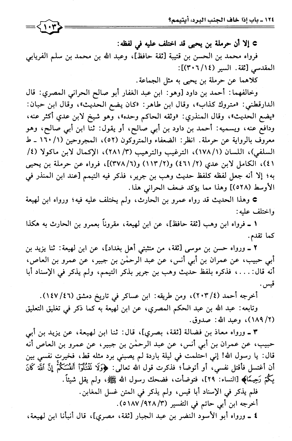 ٣ - ورواه معاذ بن فضالة [ثقة، بصري]، قال: ثنا ابن لهيعة، عن يزيد بن أبي حبيب، عن عمران بن أبي أنس، عن عبد الرحمن بن جبير، عن عمرو بن العاص أنه قال: يا رسول الله! إني احتلمت في ليلة باردة لم يصبني برد مثله قط، فخيرت نفسي بين أن أغتسل فأقتل نفسي، أو أتوضأ؛ فذكرت قول الله تعالى: {وَلَا تَقْتُلُوا أَنْفُسَكُمْ إِنَّ اللَّهَ كَانَ بِكُمْ رَحِيمًا} [النساء: ٢٩]، فتوضأت، فضحك رسول الله - صلى الله عليه وسلم -، ولم يقل شيئًا.