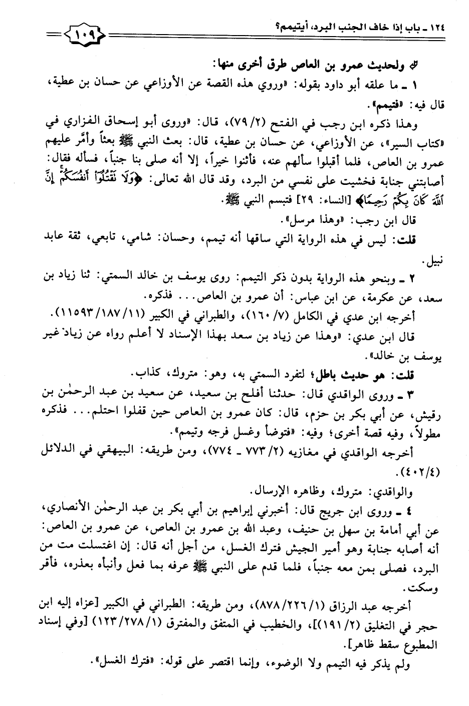 ٣ - وروى الواقدي قال: حدثنا أفلح بن سعيد، عن سعيد بن عبد الرحمن بن رقيش، عن أبي بكر بن حزم، قال: كان عمرو بن العاص حين قفلوا احتلم. . . فذكره مطولًا، وفيه قصة أخرى؛ وفيه: "فتوضأ وغسل فرجه وتيمم".