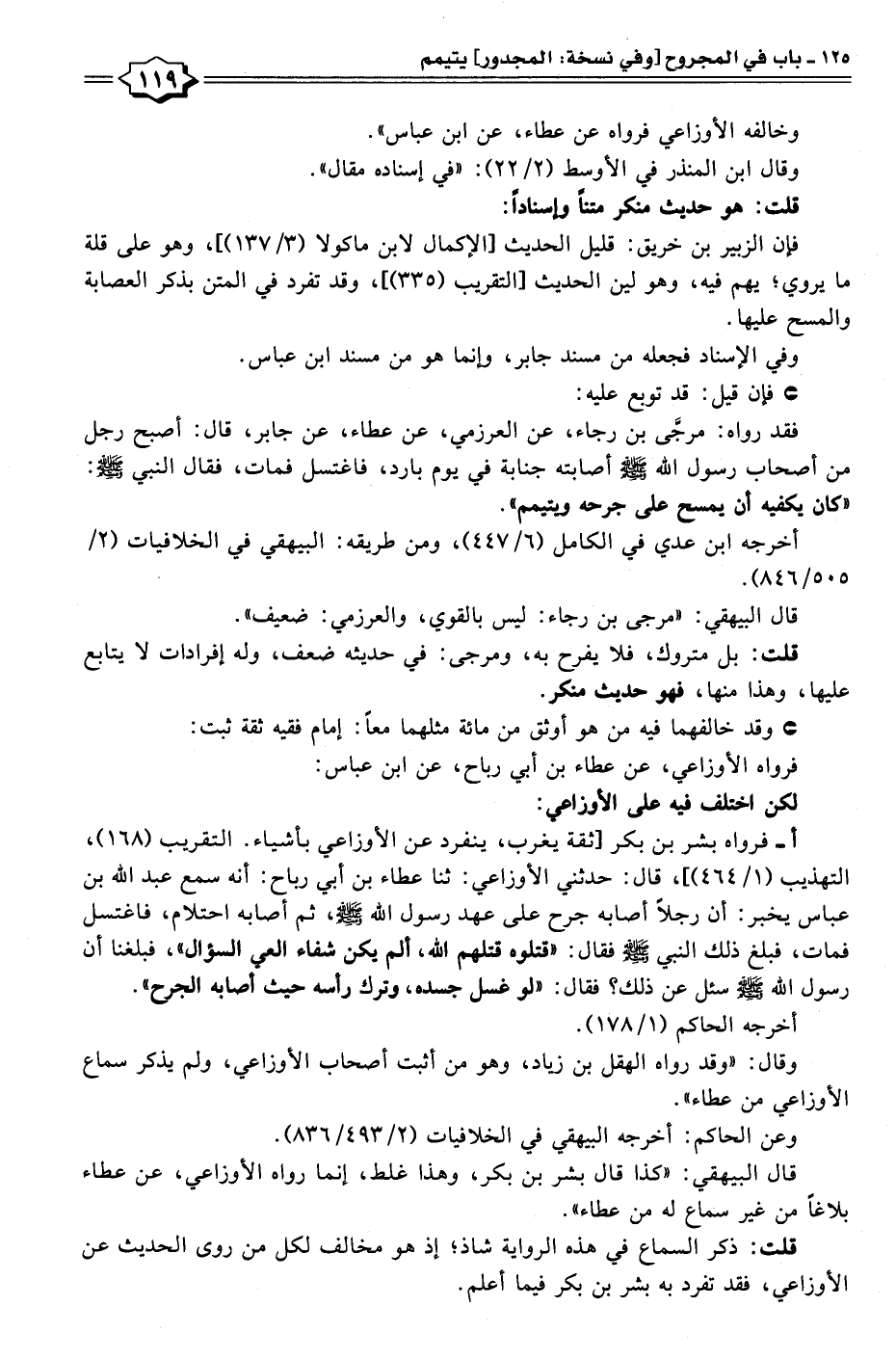 أ- فرواه بشر بن بكر [ثقة يغرب، ينفرد عن الأوزاعي بأشياء. التقريب (١٦٨)، التهذيب (١/ ٤٦٤)]، قال: حدثني الأوزاعي: ثنا عطاء بن أبي رباح: أنه سمع عبد الله بن عباس يخبر: أن رجلًا أصابه جرح على عهد رسول الله - صلى الله عليه وسلم -، ثم أصابه احتلام، فاغتسل فمات، فبلغ ذلك النبي - صلى الله عليه وسلم - فقال: "قتلوه قتلهم الله، ألم يكن شفاء العي السؤال"، فبلغنا أن رسول الله - صلى الله عليه وسلم - سئل عن ذلك؟ فقال: "لو غسل جسده، وترك رأسه حيث أصابه الجرح".