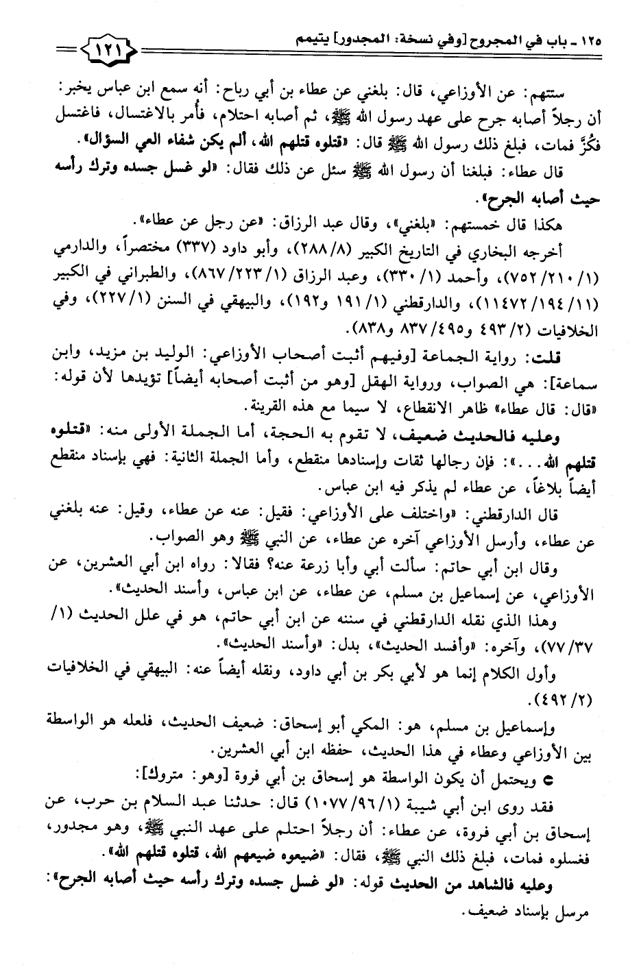 ستتهم: عن الأوزاعي، قال: بلغني عن عطاء بن أبي رباح: أنه سمع ابن عباس يخبر: أن رجلًا أصابه جرح على عهد رسول الله - صلى الله عليه وسلم -، ثم أصابه احتلام، فأُمر بالاغتسال، فاغتسل فكُزَّ فمات، فبلغ ذلك رسول الله - صلى الله عليه وسلم - قال: "قتلوه قتلهم الله، ألم يكن شفاء العي السؤال".