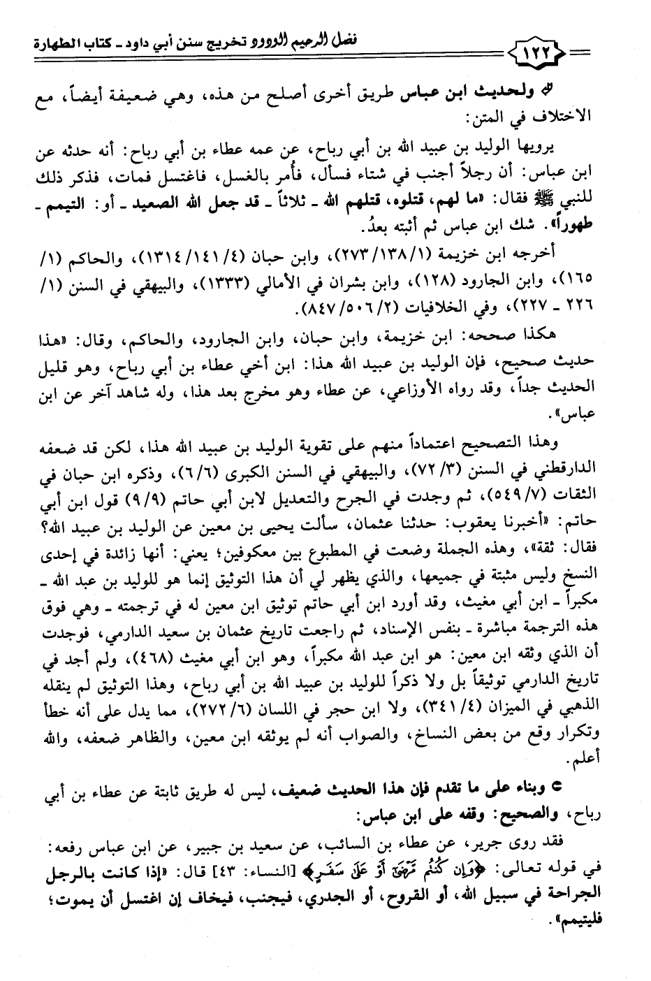 يرويها الوليد بن عبيد الله بن أبي رباح، عن عمه عطاء بن أبي رباح: أنه حدثه عن ابن عباس: أن رجلًا أجنب في شتاء فسأل، فأمر بالغسل، فاغتسل فمات، فذكر ذلك للنبي - صلى الله عليه وسلم - فقال: "ما لهم، قتلوه، قتلهم الله- ثلاثًا- قد جعل الله الصعيد -أو: التيمم- طهورًا". شك ابن عباس ثم أثبته بعدُ.