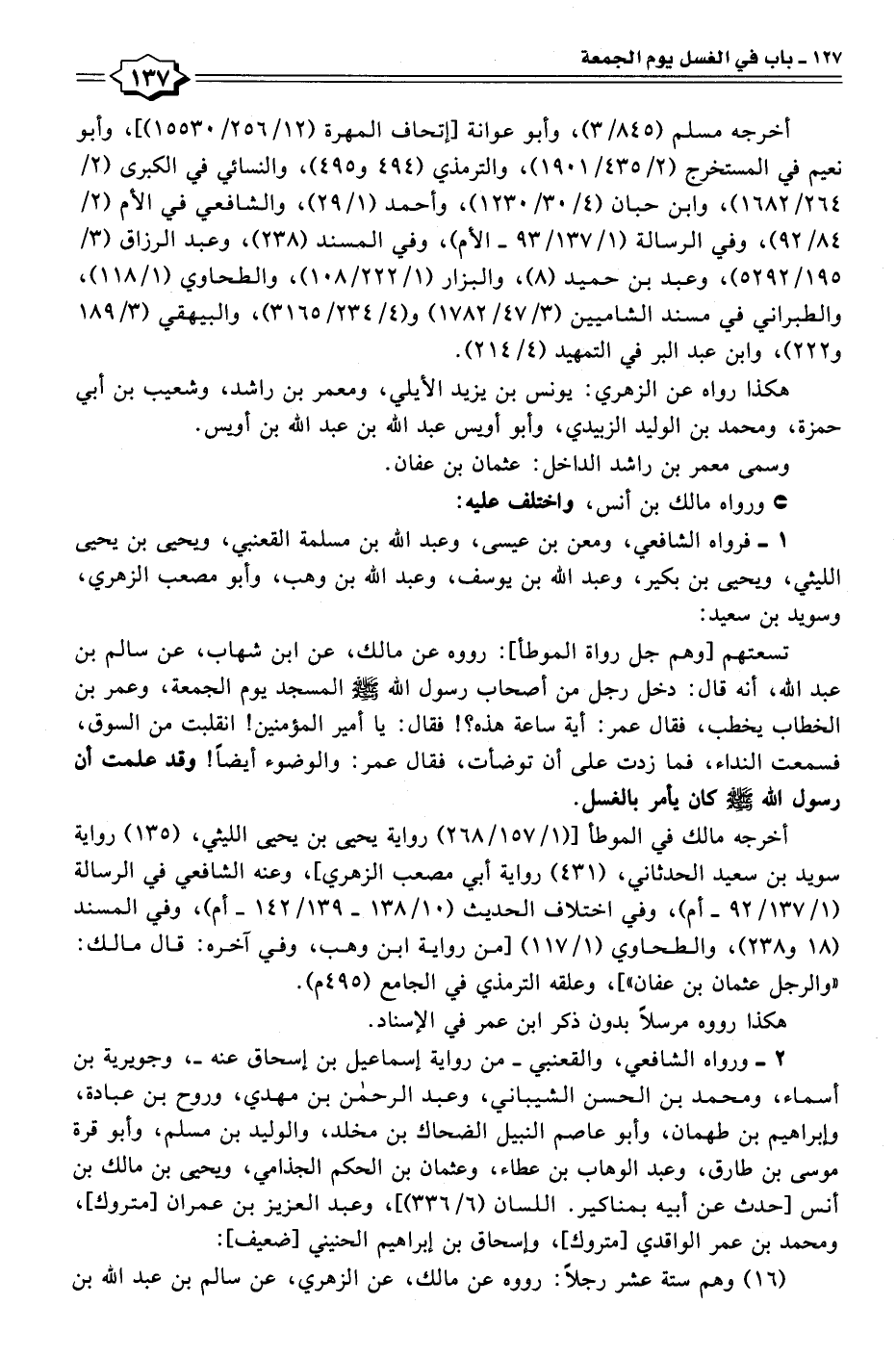 تسعتهم [وهم جل رواة الموطأ]: رووه عن مالك، عن ابن شهاب، عن سالم بن عبد الله، أنه قال: دخل رجل من أصحاب رسول الله- صلى الله عليه وسلم - المسجد يوم الجمعة، وعمر بن الخطاب يخطب، فقال عمر: أية ساعة هذه؟ , فقال: يا أمير المؤمنين, انقلبت من السوق، فسمعت النداء، فما زدت على أن توضأت، فقال عمر: والوضوء أيضًا, وقد علمت أن رسول الله- صلى الله عليه وسلم - كان يأمر بالغسل.