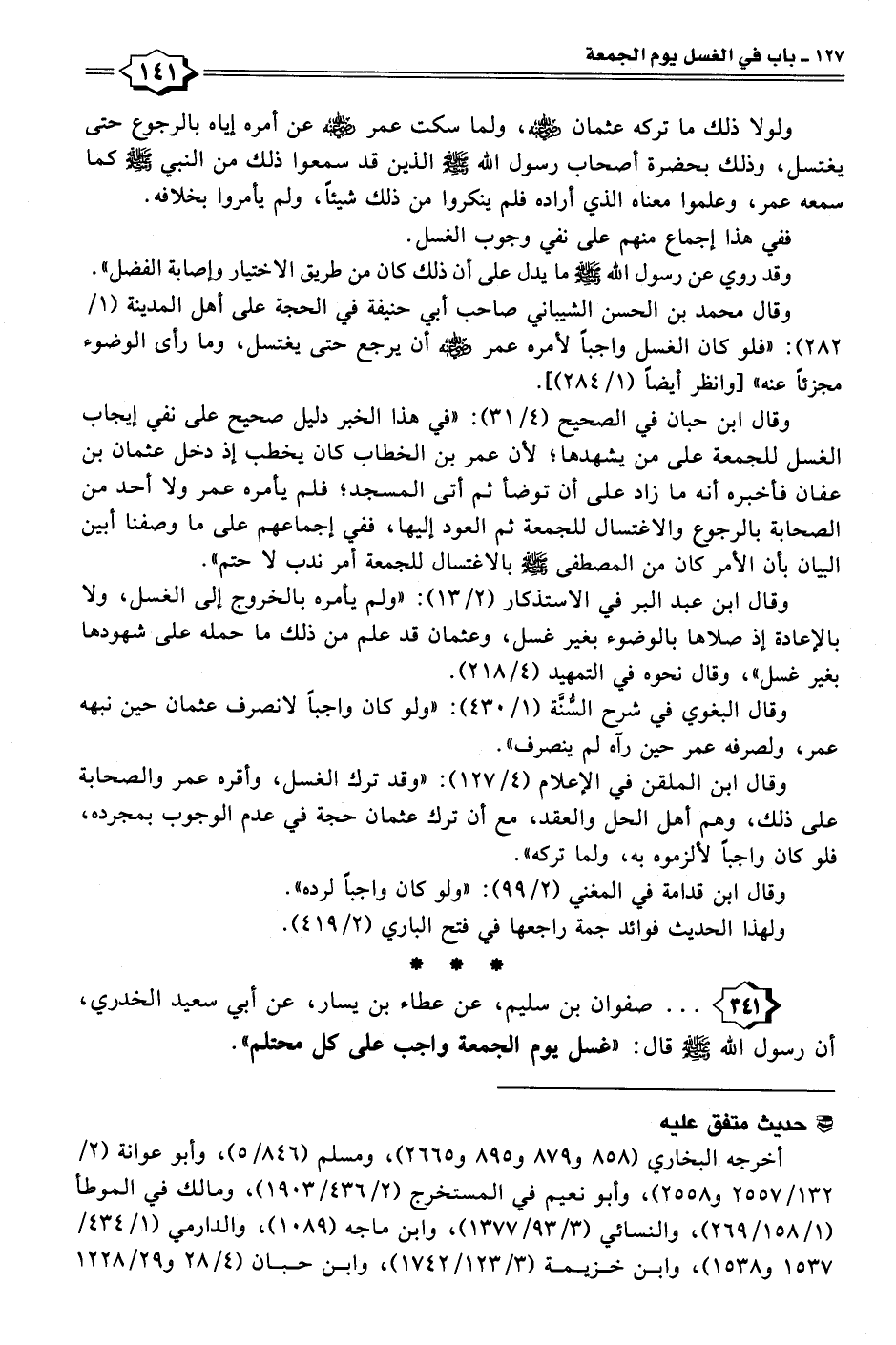 ٣٤١ - . . . صفوان بن سليم، عن عطاء بن يسار، عن أبي سعيد الخدري، أن رسول الله - صلى الله عليه وسلم - قال: "غسل يوم الجمعة واجب على كل محتلم".