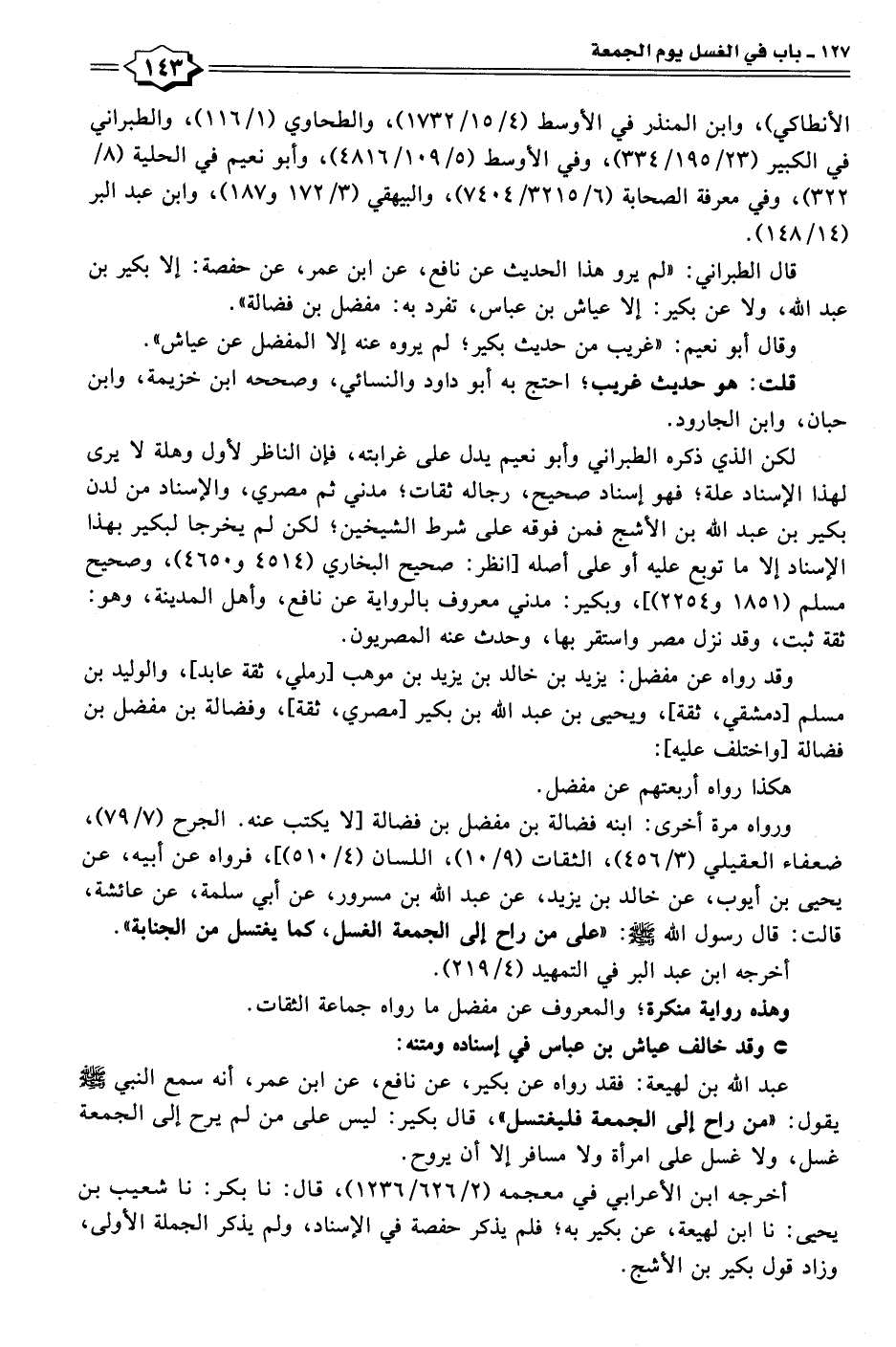 عبد الله بن لهيعة: فقد رواه عن بكير، عن نافع، عن ابن عمر، أنه سمع النبي - صلى الله عليه وسلم - يقول: "من راح إلى الجمعة فليغتسل"، قال بكير: ليس على من لم يرح إلى الجمعة غسل، ولا غسل على امرأة ولا مسافر إلا أن يروح.