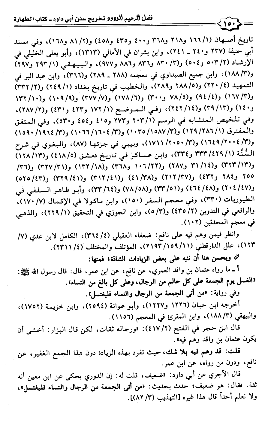 أ - ما رواه عثمان بن واقد العمري، عن نافع، عن ابن عمر، قال: قال رسول الله - صلى الله عليه وسلم -: "الغسل يوم الجمعة على كل حالم من الرجال، وعلى كل بالغ من النساء".