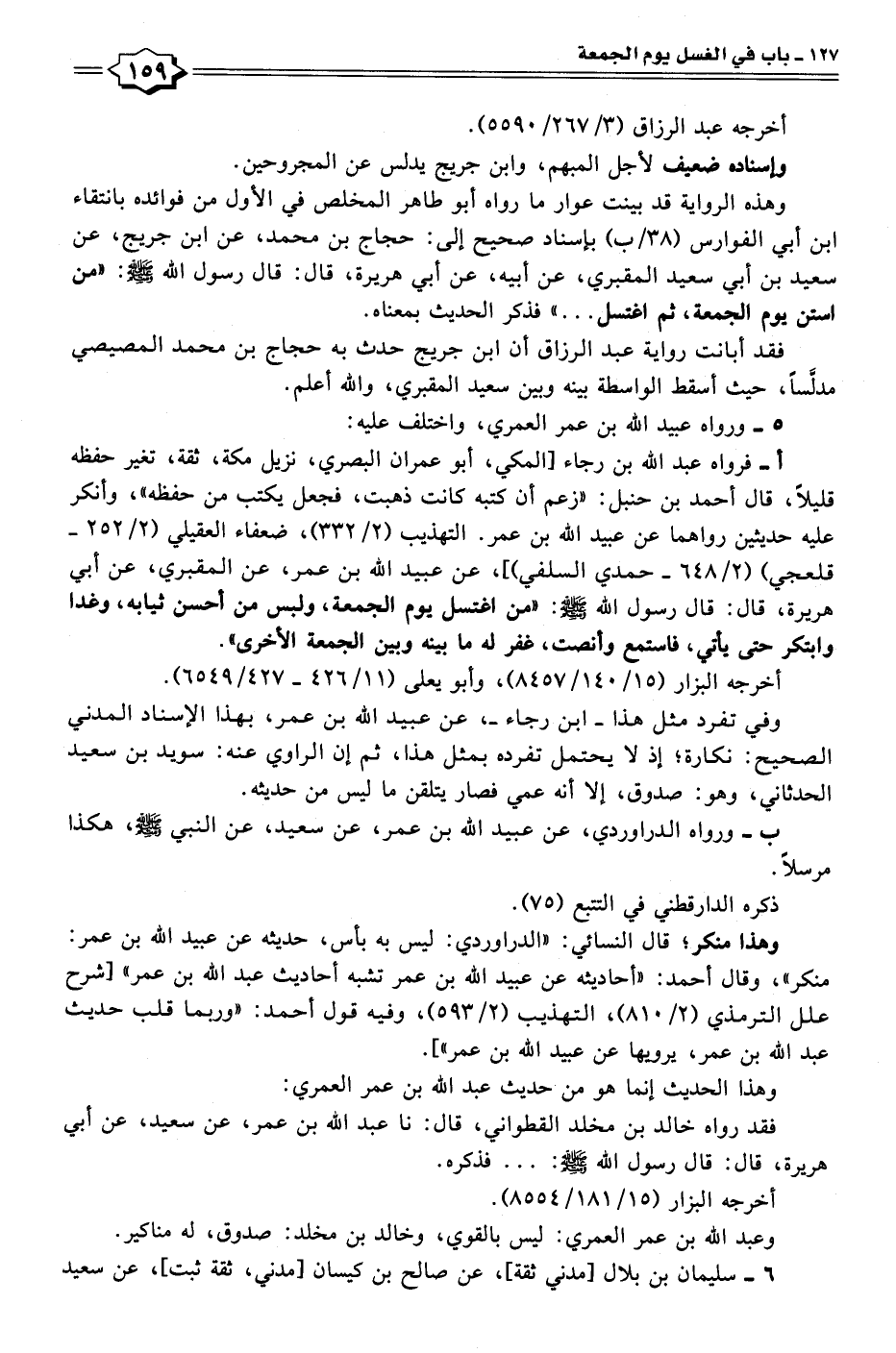 أ - فرواه عبد الله بن رجاء [المكي، أبو عمران البصري، نزيل مكة، ثقة، تغير حفظه قليلًا، قال أحمد بن حنبل: "زعم أن كتبه كانت ذهبت، فجعل يكتب من حفظه"، وأنكر عليه حديثين رواهما عن عبيد الله بن عمر. التهذيب (٢/ ٣٣٢)، ضعفاء العقيلي (٢/ ٢٥٢ - قلعجي) (٢/ ٦٤٨ - حمدي السلفي)] , عن عبيد الله بن عمر، عن المقبري، عن أبي هريرة، قال: قال رسول الله - صلى الله عليه وسلم -: "من اغتسل يوم الجمعة، ولبس من أحسن ثيابه، وغدا وابتكر حتى يأتي، فاستمع وأنصت، غفر له ما بينه وبين الجمعة الأخرى".