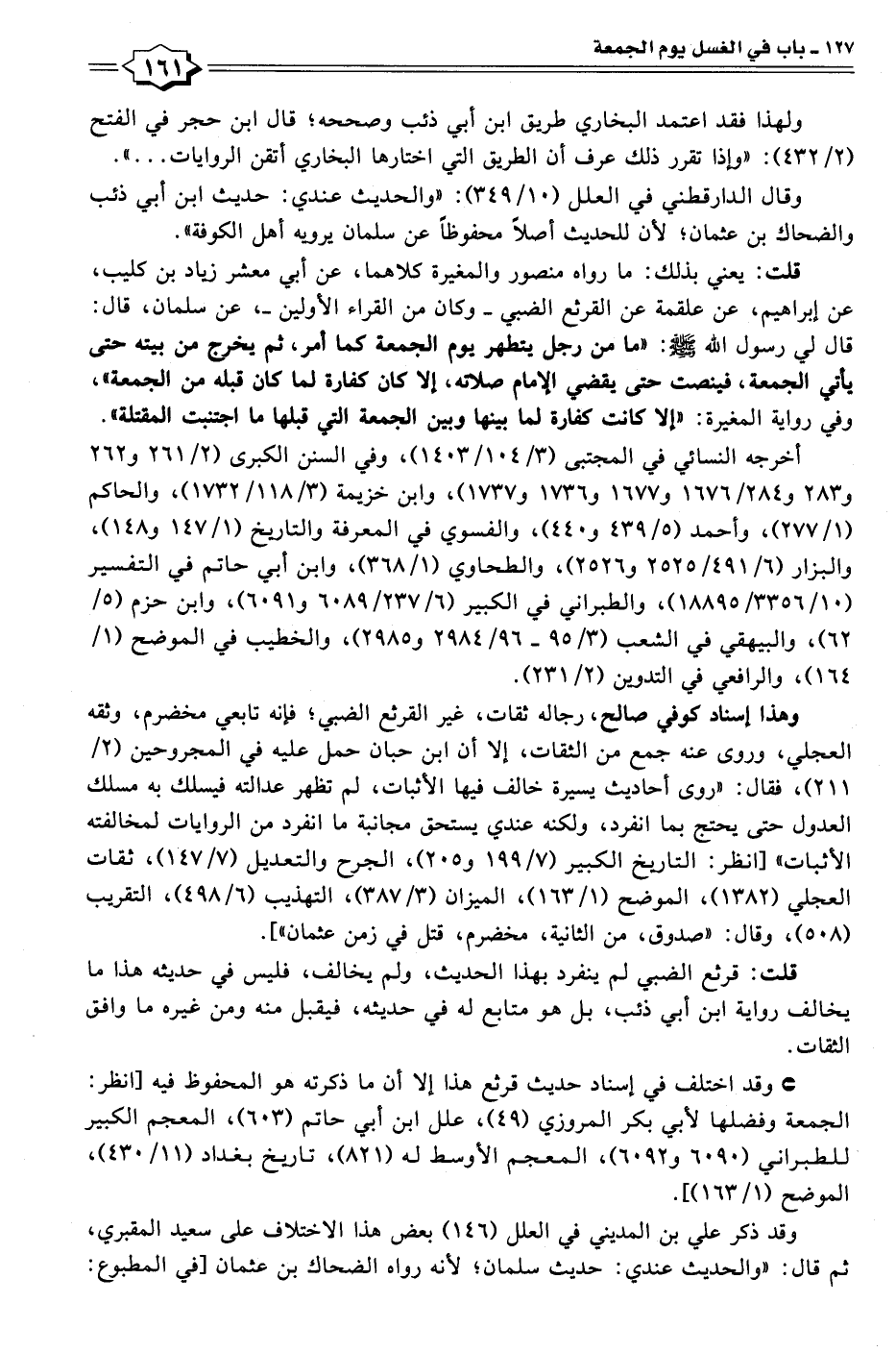 قلت: يعني بذلك: ما رواه منصور والمغيرة كلاهما، عن أبي معشر زياد بن كليب، عن إبراهيم، عن علقمة عن القرثع الضبي -وكان من القراء الأولين-، عن سلمان، قال: قال لي رسول الله - صلى الله عليه وسلم -: "ما من رجل ينطهر يوم الجمعة كما أمر، ثم يخرج من بيته حتى يأتي الجمعة، فينصت حتى يقضي الإمام صلاته، إلا كان كفارة لما كان قبله من الجمعة" وفي رواية المغيرة: "إلا كانت كفارة لما بينها وبين الجمعة التي قبلها ما اجتنبت المقتلة".