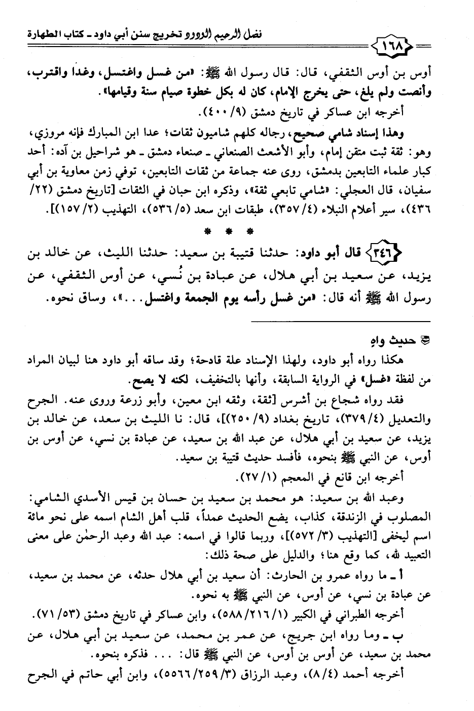 ٣٤٦ - قال أبو داود: حدثنا قتيبة بن سعيد: حدثنا الليث، عن خالد بن يزيد، عن سعيد بن أبي هلال، عن عبادة بن نُسي، عن أوس الثقفي، عن رسول الله - صلى الله عليه وسلم - أنه قال: "من غسل رأسه يوم الجمعة واغتسل ... "، وساق نحوه.