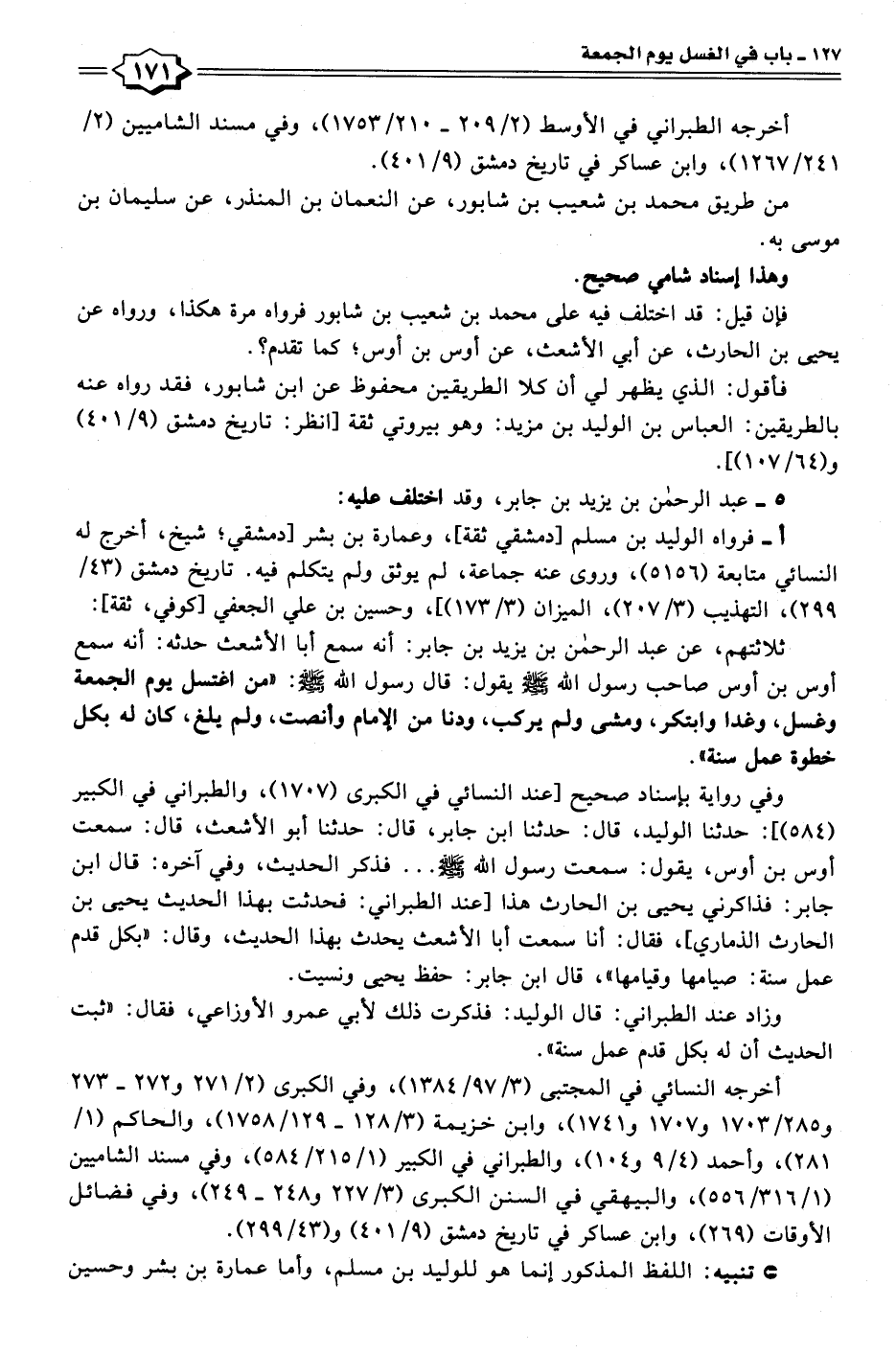 وفي رواية بإسناد صحيح [عند النسائي في الكبرى (١٧٠٧)، والطبراني في الكبير (٥٨٤)]: حدثنا الوليد، قال: حدثنا ابن جابر، قال: حدثنا أبو الأشعث، قال: سمعت أوس بن أوس، يقول: سمعت رسول الله - صلى الله عليه وسلم - . . . فذكر الحديث، وفي آخره: قال ابن جابر: فذاكرني يحيى بن الحارث هذا [عند الطبراني: فحدثت بهذا الحديث يحيى بن الحارث الذماري] , فقال: أنا سمعت أبا الأشعث يحدث بهذا الحديث، وقال: "بكل قدم عمل سنة: صيامها وقيامها"، قال ابن جابر: حفظ يحيى ونسيت.