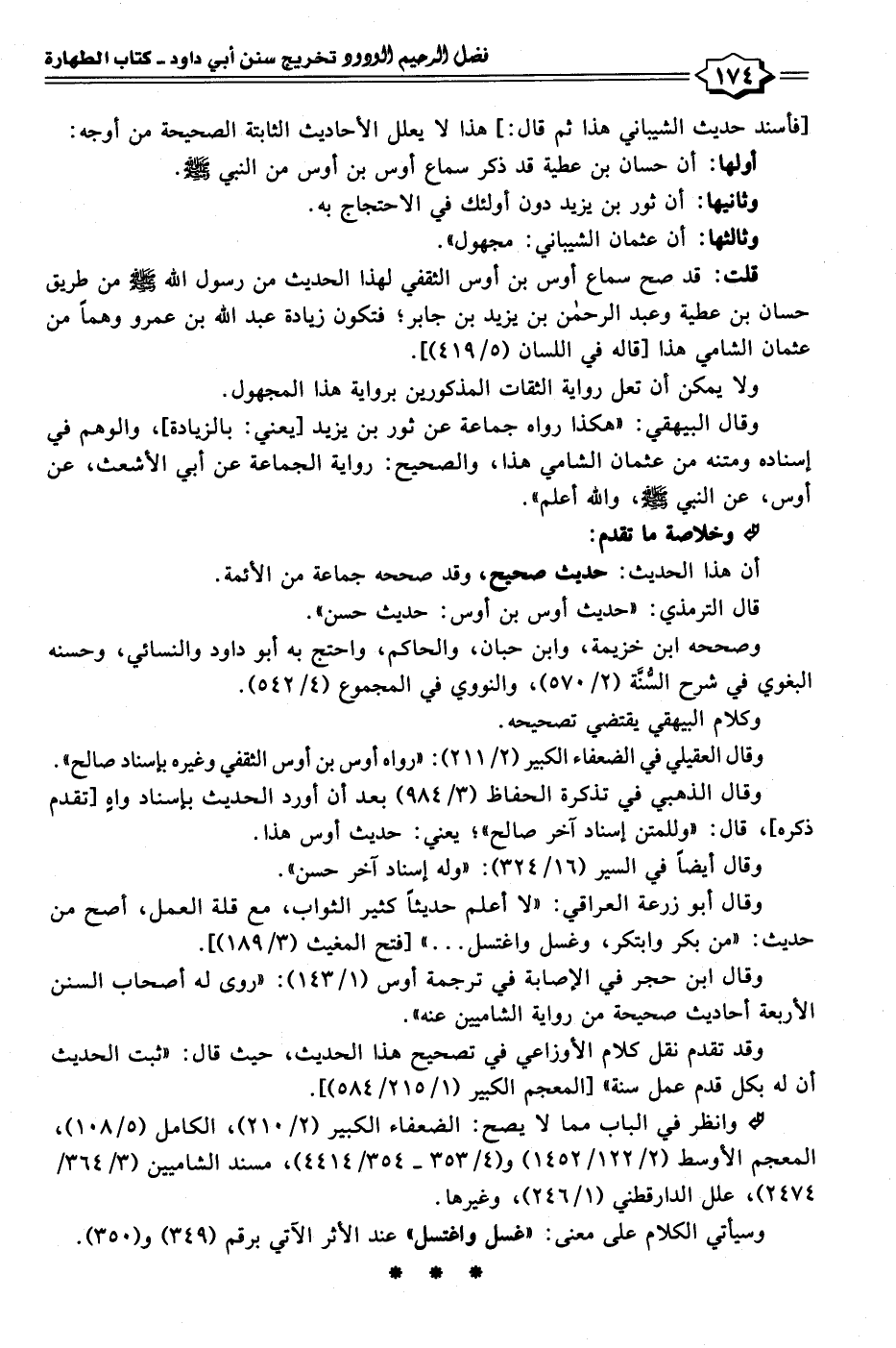 وقال البيهقي: "هكذا رواه جماعة عن ثور بن يزيد [يعني: بالزيادة] , والوهم في إسناده ومتنه من عثمان الشامي هذا، والصحيح: رواية الجماعة عن أبي الأشعث، عن أوس، عن النبي - صلى الله عليه وسلم -، والله أعلم".