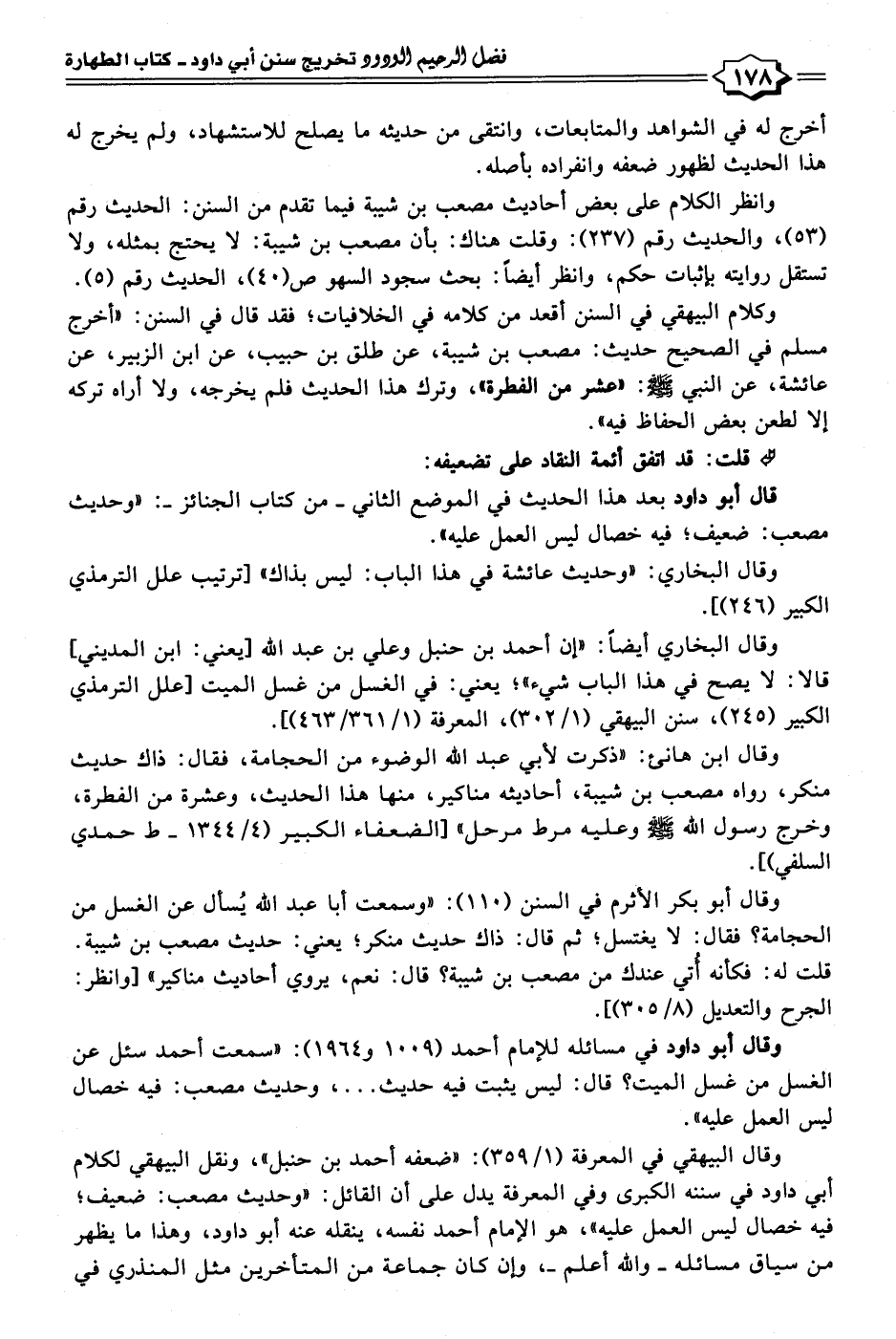 وقال البيهقي في المعرفة (١/ ٣٥٩): "ضعفه أحمد بن حنبل"، ونقل البيهقي لكلام أبي داود في سننه الكبرى وفي المعرفة يدل على أن القائل: "وحديث مصعب: ضعيف؛ فيه خصال ليس العمل عليه"، هو الإمام أحمد نفسه، ينقله عنه أبو داود، وهذا ما يظهر من سياق مسائله -والله أعلم-، وإن كان جماعة من المتأخرين مثل المنذري في