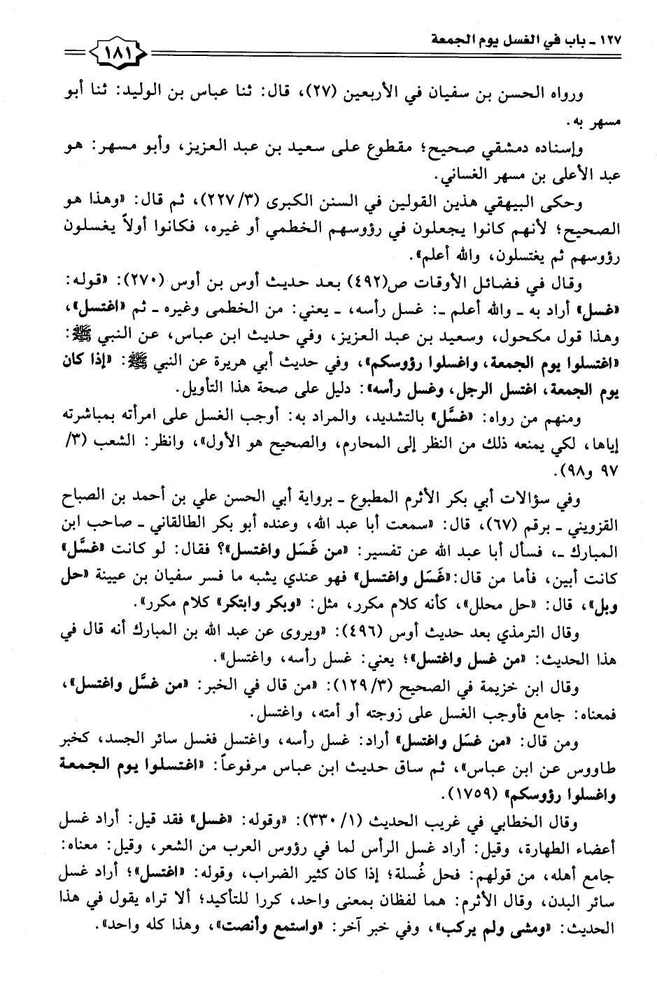 وقال في فضائل الأوقات ص (٤٩٢) بعد حديث أوس بن أوس (٢٧٠): "قوله: "غسل" أراد به -والله أعلم-: غسل رأسه، -يعني: من الخطمى وغيره- ثم "اغتسل"، وهذا قول مكحول، وسعيد بن عبد العزيز، وفي حديث ابن عباس، عن النبي - صلى الله عليه وسلم -: "اغتسلوا يوم الجمعة، واغسلوا رؤوسكم"، وفي حديث أبي هريرة عن النبي - صلى الله عليه وسلم -: "إذا كان يوم الجمعة، اغتسل الرجل، وغسل رأسه": دليل على صحة هذا التأويل.