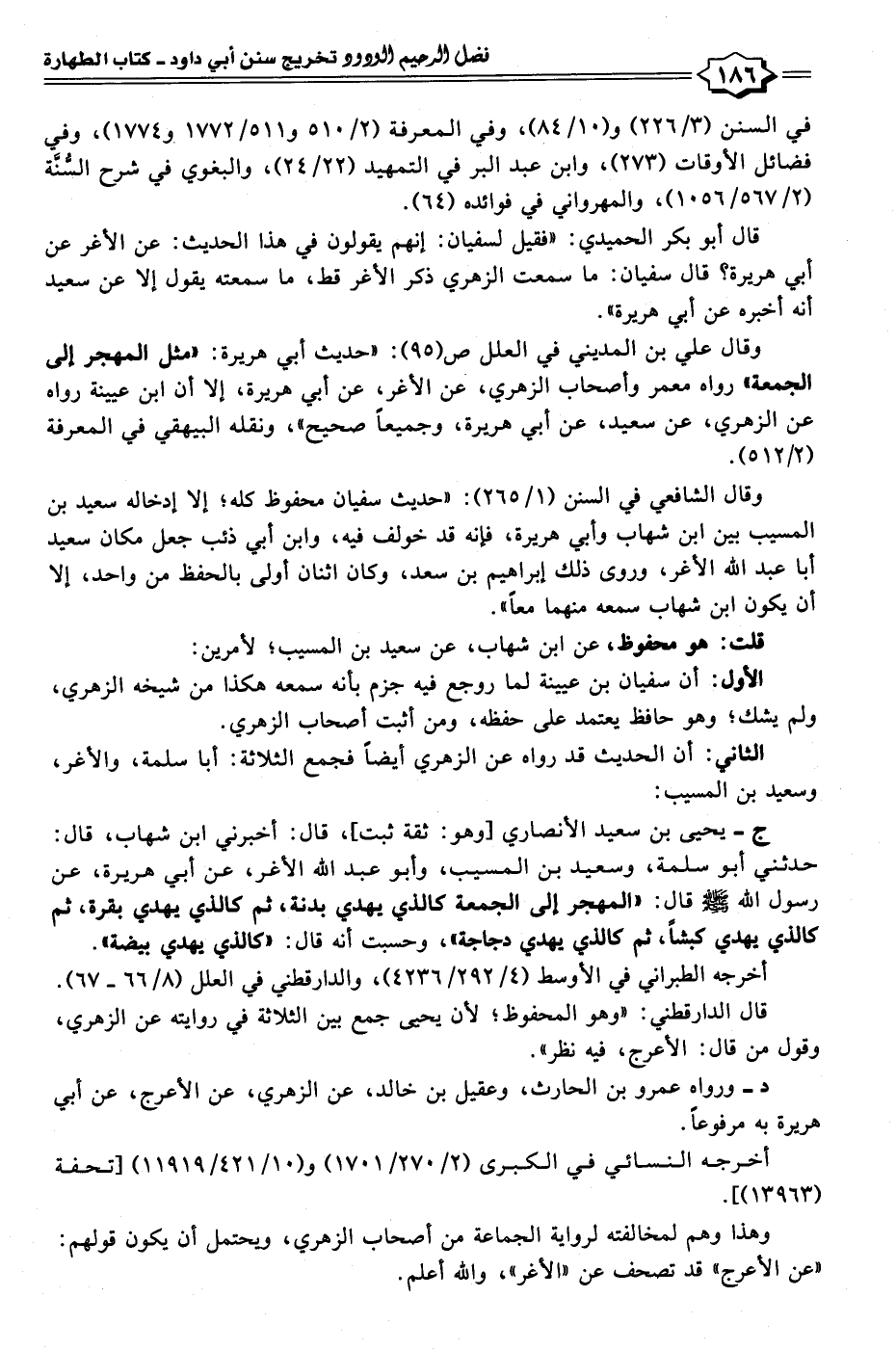 ج - يحيى بن سعيد الأنصاري [وهو: ثقة ثبت]، قال: أخبرني ابن شهاب، قال: حدثني أبو سلمة، وسعيد بن المسيب، وأبو عبد الله الأغر، عن أبي هريرة، عن رسول الله - صلى الله عليه وسلم - قال: "المهجر إلى الجمعة كالذي يهدي بدنة، ثم كالذي يهدي بقرة، ثم كالذي يهدي كبشًا، ثم كالذي يهدي دجاجة"، وحسبت أنه قال: "كالذي يهدي بيضة".
