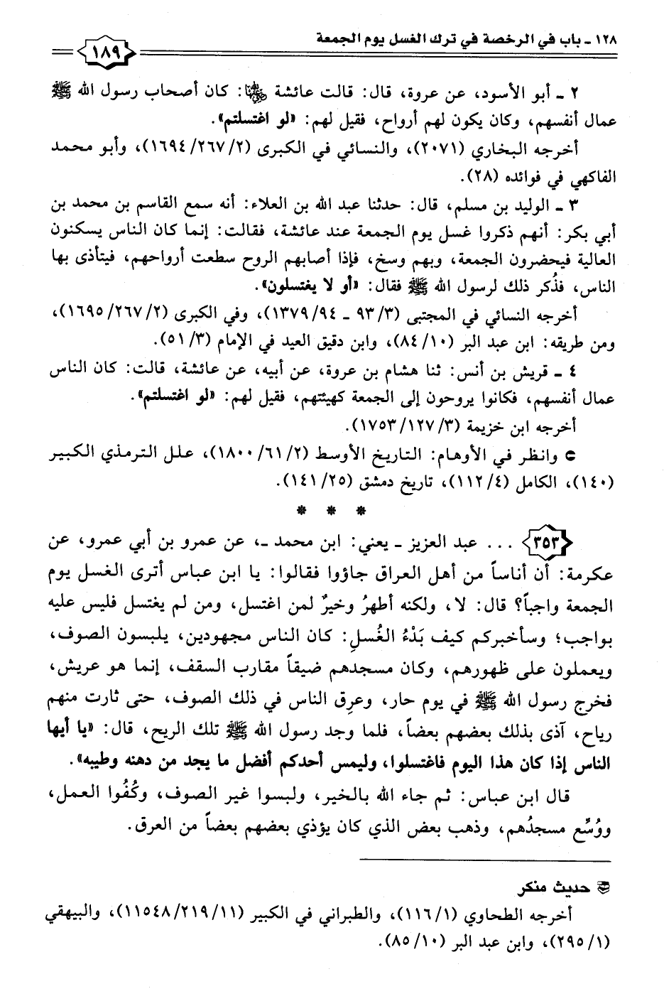 ٤ - قريش بن أنس: ثنا هشام بن عروة، عن أبيه، عن عائشة، قالت: كان الناس عمال أنفسهم، فكانوا يروحون إلى الجمعة كهيئتهم، فقيل لهم: "لو اغتسلتم".