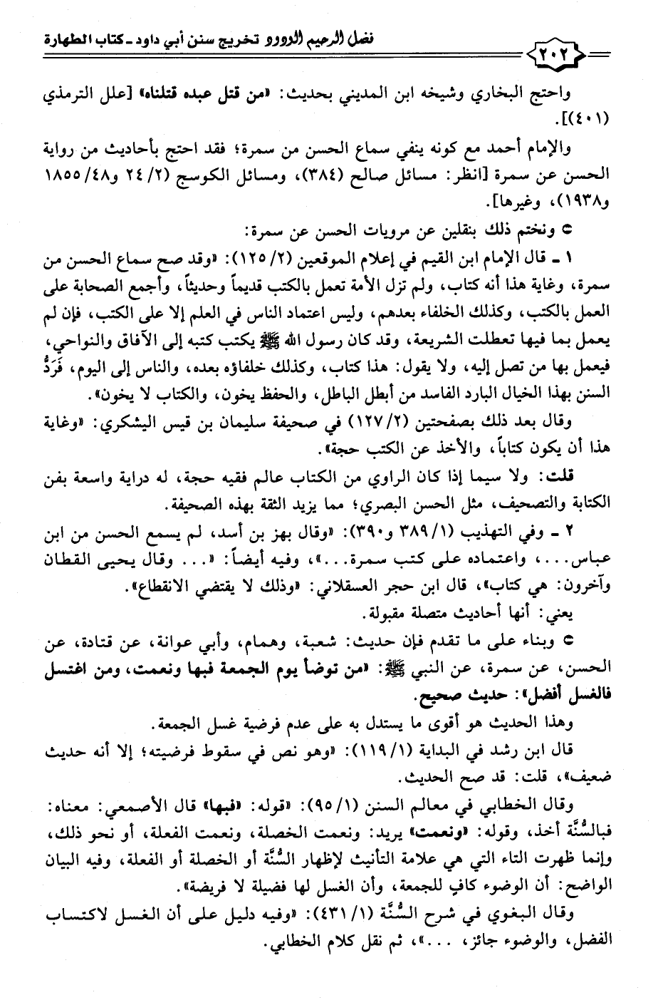 ١ - قال الإمام ابن القيم في إعلام الموقعين (٢/ ١٢٥): "وقد صح سماع الحسن من سمرة، وغاية هذا أنه كتاب، ولم تزل الأمة تعمل بالكتب قديمًا وحديثًا، وأجمع الصحابة على العمل بالكتب، وكذلك الخلفاء بعدهم، وليس اعتماد الناس في العلم إلا على الكتب، فإن لم يعمل بما فيها تعطلت الشريعة، وقد كان رسول الله - صلى الله عليه وسلم - يكتب كتبه إلى الآفاق والنواحي، فيعمل بها من تصل إليه، ولا يقول: هذا كتاب، وكذلك خلفاؤه بعده، والناس إلى اليوم، فَرَدُّ السنن بهذا الخيال البارد الفاسد من أبطل الباطل، والحفظ يخون، والكتاب لا يخون".
