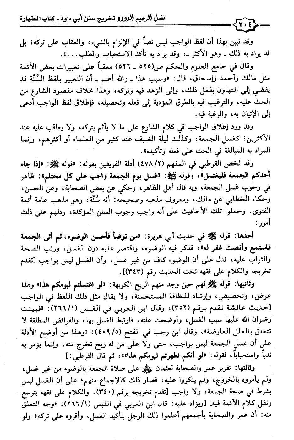 وقد لخص القرطبي في المفهم (٢/ ٤٧٨) أدلة الفريقين بقوله: "قوله - صلى الله عليه وسلم -: "إذا جاء أحدكم الجمعة فليغتسل"، وقوله - صلى الله عليه وسلم -: "غسل يوم الجمعة واجب على كل محتلم": ظاهر في وجوب غسل الجمعة، وبه قال أهل الظاهر، وحكي عن بعض الصحابة، وعن الحسن، وحكاه الخطابي عن مالك، ومعروف مذهبه وصحيحه: أنه سُنَّة، وهو مذهب عامة أئمة الفتوى. وحملوا تلك الأحاديث على أنه واجب وجوب السنن المؤكدة، ودلهم على ذلك أمور:
