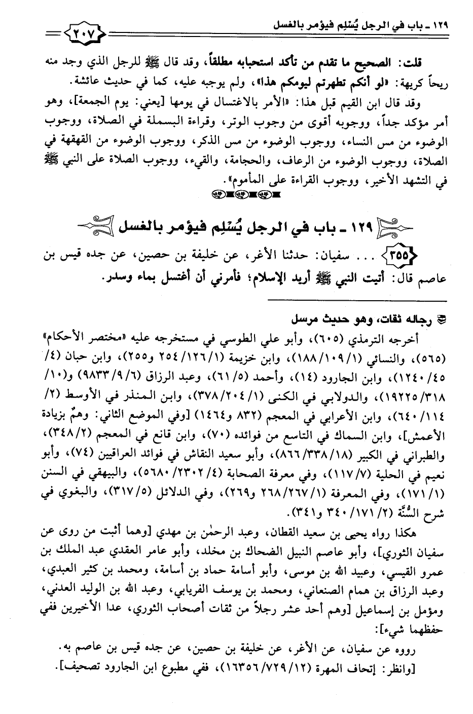 ٣٥٥ - . . . سفيان: حدثنا الأغر، عن خليفة بن حصين، عن جده قيس بن عاصم قال: أتيت النبي - صلى الله عليه وسلم - أريد الإسلام؛ فأمرني أن أغتسل بماء وسدر.
