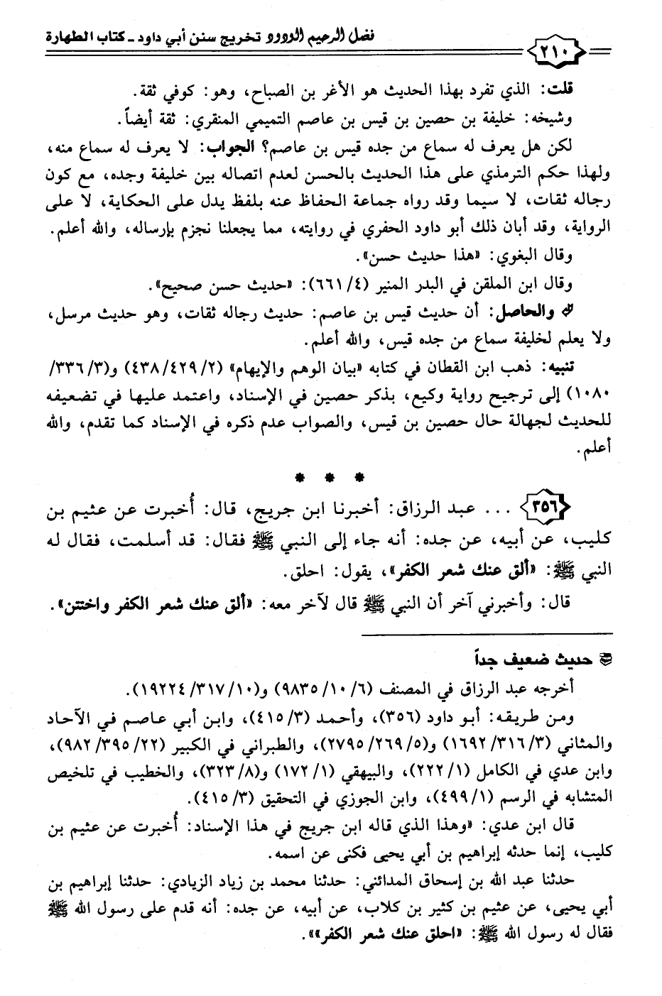 ٣٥٦ - . . . عبد الرزاق: أخبرنا ابن جريج، قال: أُخبرت عن عثيم بن كليب، عن أبيه، عن جده: أنه جاء إلى النبي - صلى الله عليه وسلم - فقال: قد أسلمت، فقال له النبي - صلى الله عليه وسلم -: "ألق عنك شعر الكفر"، يقول: احلق.