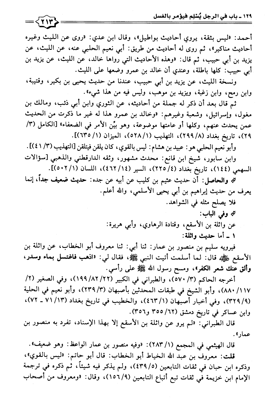 فيرويه سليم بن منصور بن عمار: ثنا أبي: ثنا معروف أبو الخطاب، عن واثلة بن الأسقع - رضي الله عنه - قال: لما أسلمت أتيت النبي - صلى الله عليه وسلم -، فقال لي: "اذهب فاغتسل بماء وسدر، وألق عنك شعر الكفر"، ومسح رسول الله - صلى الله عليه وسلم - على رأسي.