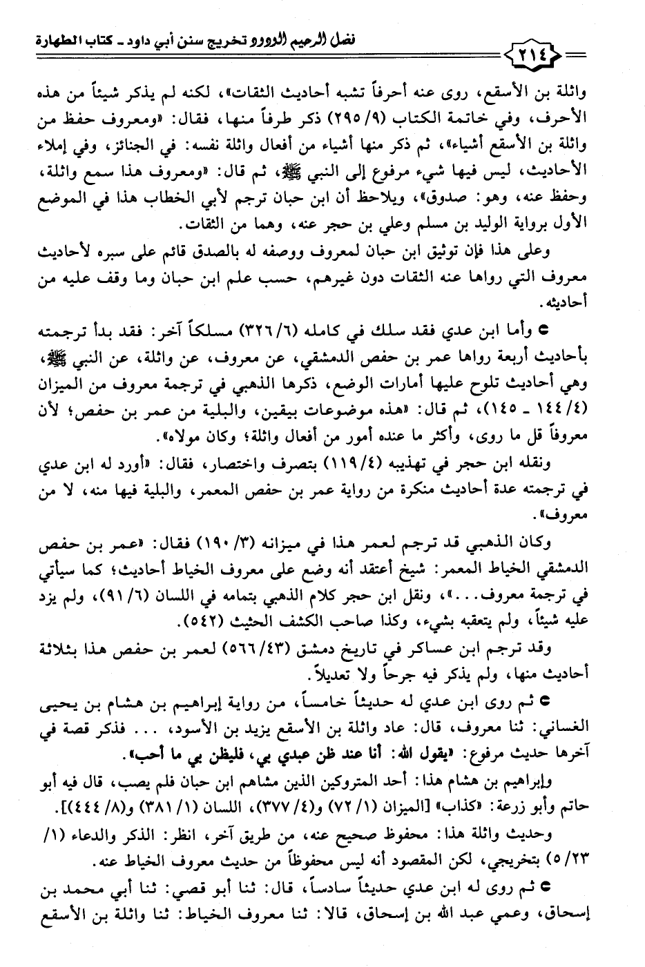 • وأما ابن عدي فقد سلك في كامله (٦/ ٣٢٦) مسلكًا آخر: فقد بدأ ترجمته بأحاديث أربعة رواها عمر بن حفص الدمشقي، عن معروف، عن واثلة، عن النبي - صلى الله عليه وسلم -، وهي أحاديث تلوح عليها أمارات الوضع، ذكرها الذهبي في ترجمة معروف من الميزان (٤/ ١٤٤ - ١٤٥)، ثم قال: "هذه موضوعات بيقين، والبلية من عمر بن حفص؛ لأن معروفًا قل ما روى، وأكثر ما عنده أمور من أفعال واثلة؛ وكان مولاه".