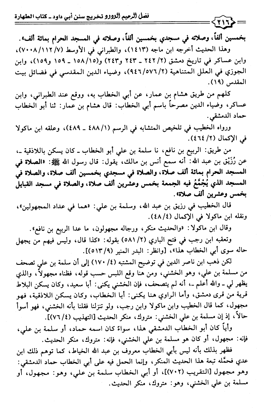 لكن ذهب ابن ناصر الدين في توضيح المشتبه (٤/ ١٧٠) إلى أن سلمة بن علي تصحف من مسلمة بن علي، وهو الخشني، ومن هنا وقع اللبس حسب قوله، فظناه مجهولًا، والذي يظهر لي -والله أعلم-، أنه لم يتصحف، فان الخشني يكنى: أبا سعيد، وكان يسكن البلاط قرية من قرى دمشق، وأما الراوي هنا يكنى: أبا الخطاب، وكان يسكن اللاذقية، فهو مجهول، كما قال الخطيب وابن ماكولا وابن رجب، ولو تنزلنا فقلنا بأنه الخشني، فهو أسوأ حالًا، إذ إن مسلمة بن علي الخشني: متروك، منكر الحديث [التهذيب (٤/ ٧٦)].