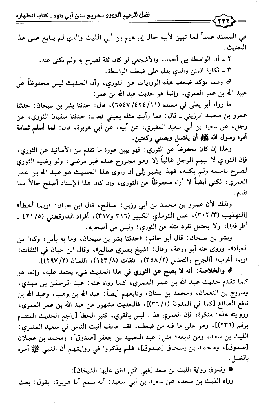 • والخلاصة: أنه لا يصح عن الثوري في هذا الحديث شيء يعتمد عليه، وإنما هو كما تقدم حديث عبد الله بن عمر العمري، كما رواه عنه: عبد الرحمن بن مهدي، وسريج بن النعمان، ومحمد بن سنان، وتابعهم أيضًا: عبد الله بن وهب، وعبد الله بن نافع الصائغ [كما في المدونة (١/ ٣٦)]، فالحديث مشهور عن عبد الله بن عمر العمري، وروايته هذه: منكرة؛ فإن العمري هذا: ليس بالقوي، كثير الخطأ [راجع الحديث المتقدم برقم (٢٣٦)]، وهو على ما فيه من ضعف، فقد خالف أثبت الناس في سعيد المقبري: الليث بن سعد، ومن تابعه؛ مثل: عبد الحميد بن جعفر [صدوق]، ومحمد بن عجلان [صدوق]، ومحمد بن إسحاق [صدوق]، فلم يذكروا في روايتهم أن النبي - صلى الله عليه وسلم - أمره بالغسل.