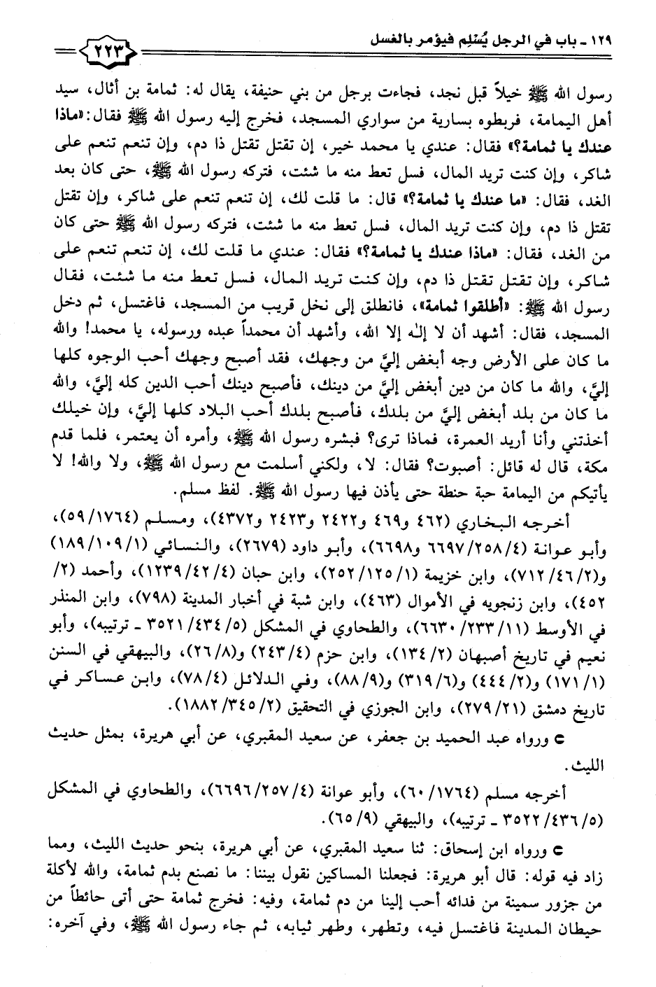 • ورواه ابن إسحاق: ثنا سعيد المقبري، عن أبي هريرة، بنحو حديث الليث، ومما زاد فيه قوله: قال أبو هريرة: فجعلنا المساكين نقول بيننا: ما نصنع بدم ثمامة، والله لأكلة من جزور سمينة من فدائه أحب إلينا من دم ثمامة، وفيه: فخرج ثمامة حتى أتى حائطًا من حيطان المدينة فاغتسل فيه، وتطهر، وطهر ثيابه، ثم جاء رسول الله - صلى الله عليه وسلم -، وفي آخره: