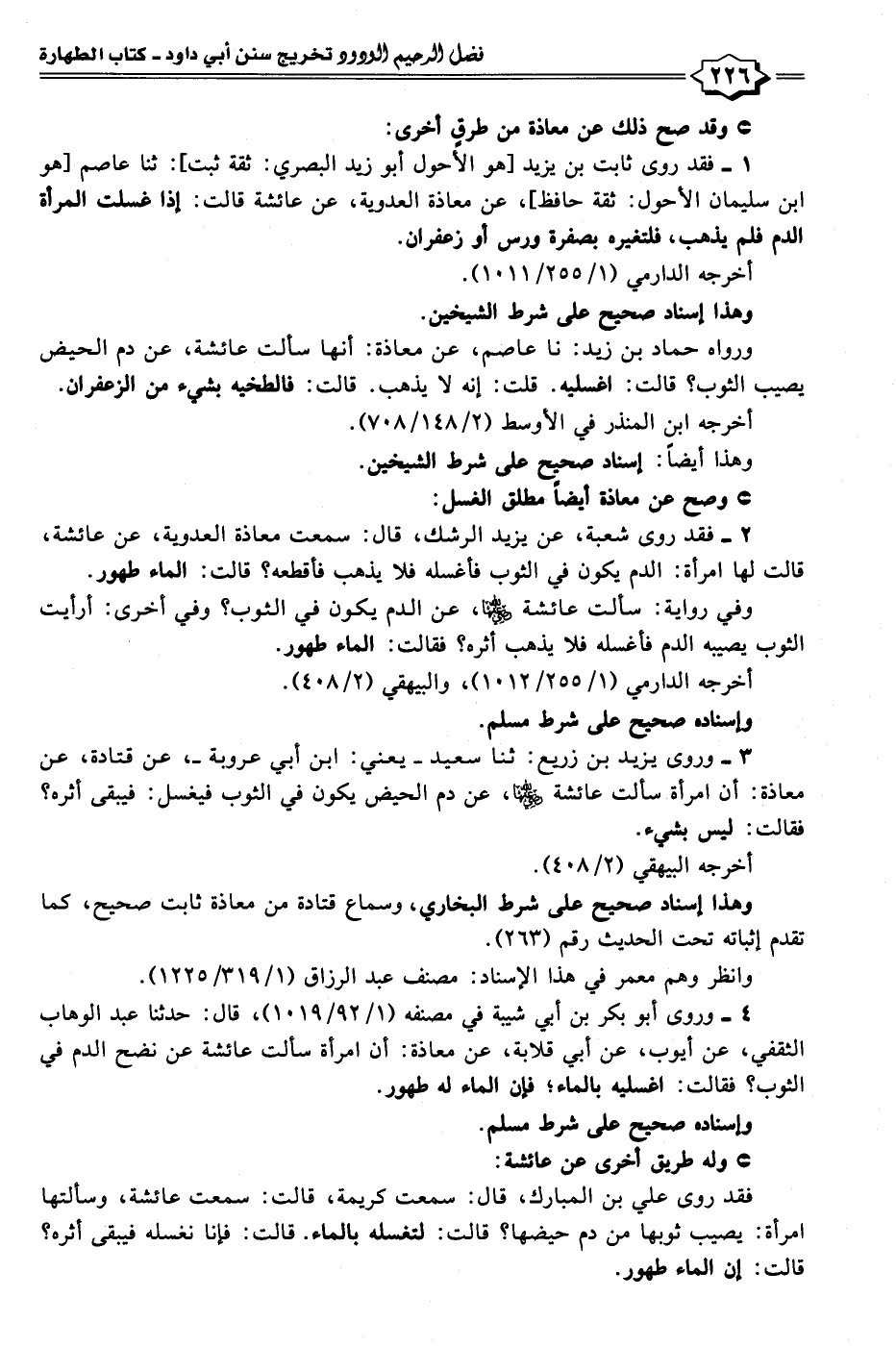 ١ - فقد روى ثابت بن يزيد [هو الأحول أبو زيد البصري: ثقة ثبت]: ثنا عاصم [هو ابن سليمان الأحول: ثقة حافظ]، عن معاذة العدوية، عن عائشة قالت: إذا غسلت المرأة الدم فلم يذهب، فلتغيره بصفرة ورس أو زعفران.