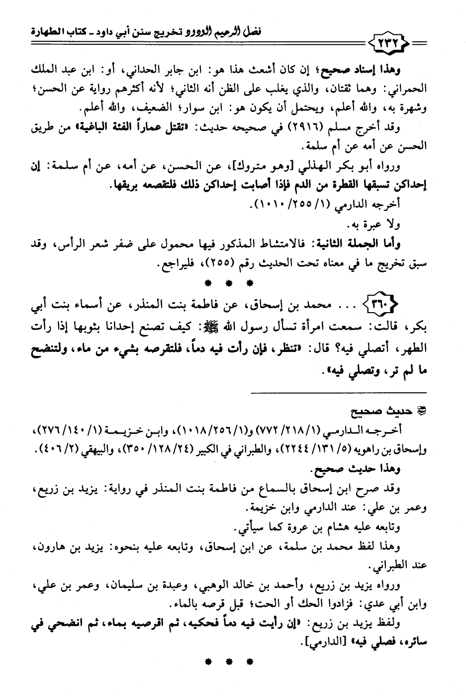 ورواه أبو بكر الهذلي [وهو متروك]، عن الحسن، عن أمه، عن أم سلمة: إن إحداكن تسبقها القطرة من الدم فإذا أصابت إحداكن ذلك فلتقصعه بريقها.