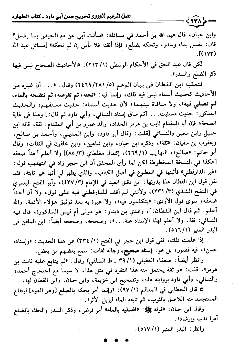 وابن حبان، قال عبد الله بن أحمد في مسائله: "سألت أبي عن دم الحيض بما يغسل؟ قال: يغسل بماء وسدر، وتحكه بضلع، فإذا أنقته فلا بأس إن لم تحكه" [مسائل عبد الله (١٧٣)].