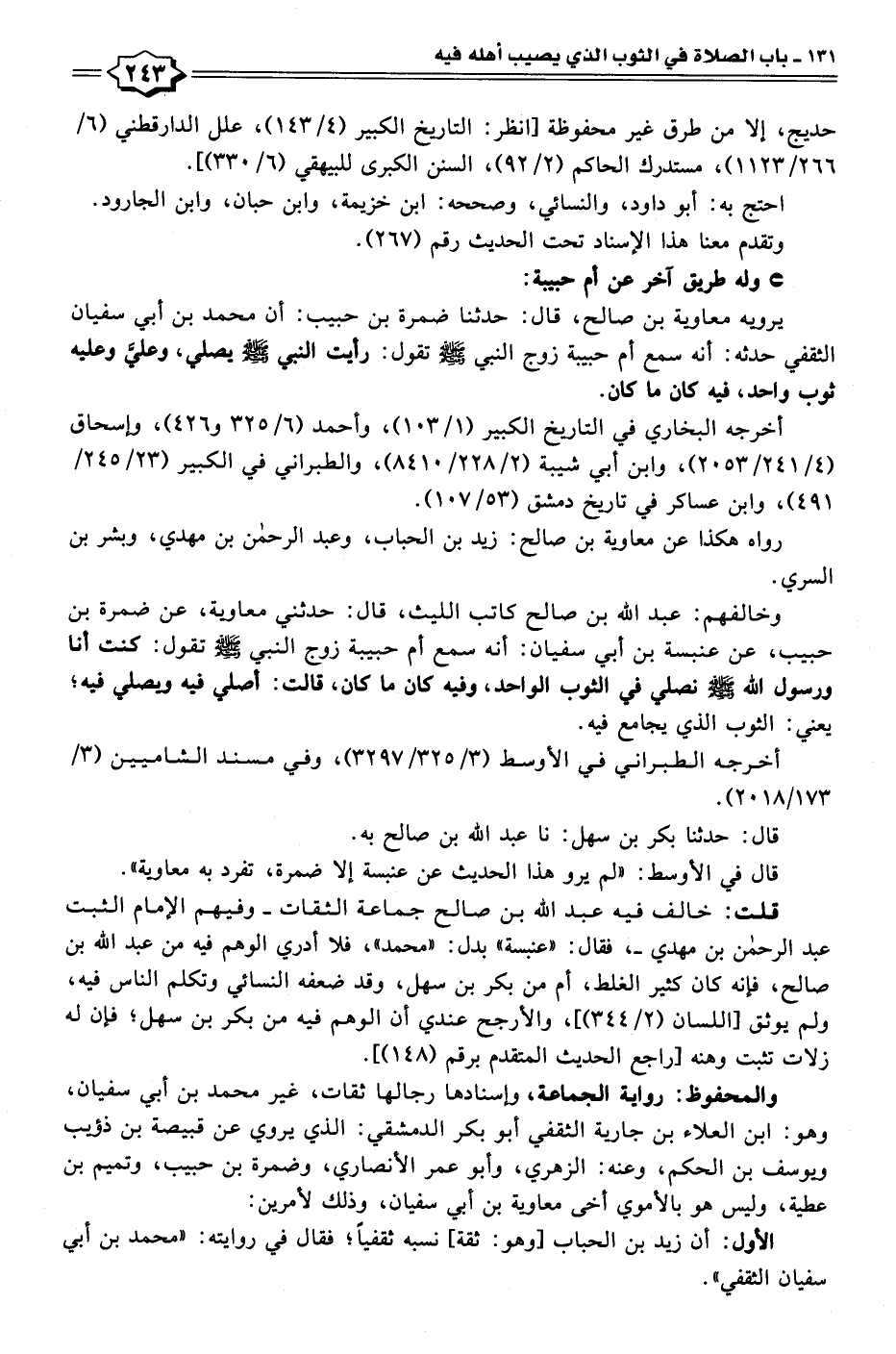 يرويه معاوية بن صالح، قال: حدثنا ضمرة بن حبيب: أن محمد بن أبي سفيان الثقفي حدثه: أنه سمع أم حبيبة زوج النبي - صلى الله عليه وسلم - تقول: رأيت النبي - صلى الله عليه وسلم - يصلي، وعليَّ وعليه ثوب واحد، فيه كان ما كان.