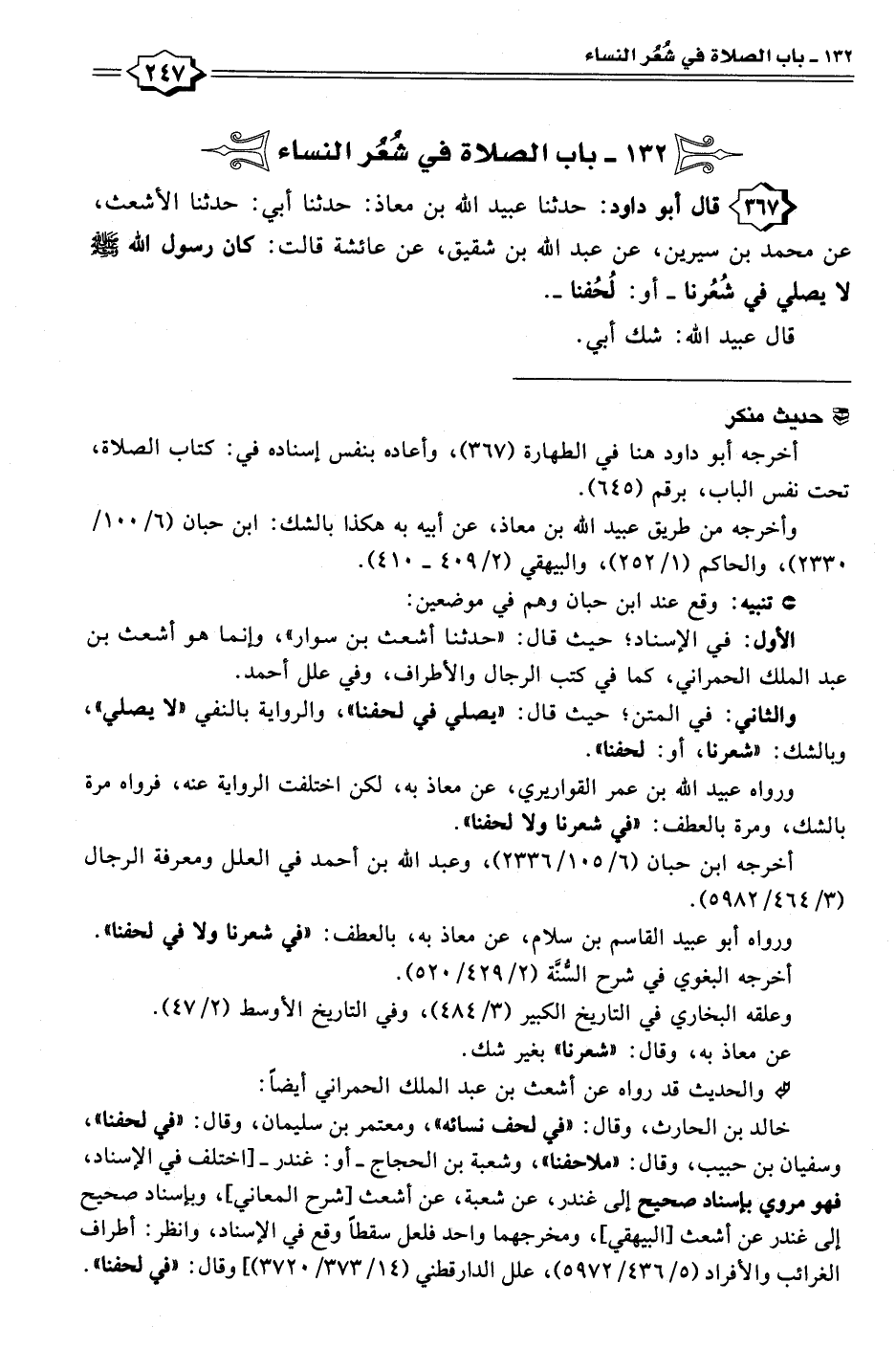 ٣٦٧ - قال أبو داود: حدثنا عبيد الله بن معاذ: حدثنا أبي: حدثنا الأشعث، عن محمد بن سيرين، عن عبد الله بن شقيق، عن عائشة قالت: كان رسول الله - صلى الله عليه وسلم - لا يصلي في شُعُرنا -أو: لُحُفنا-.