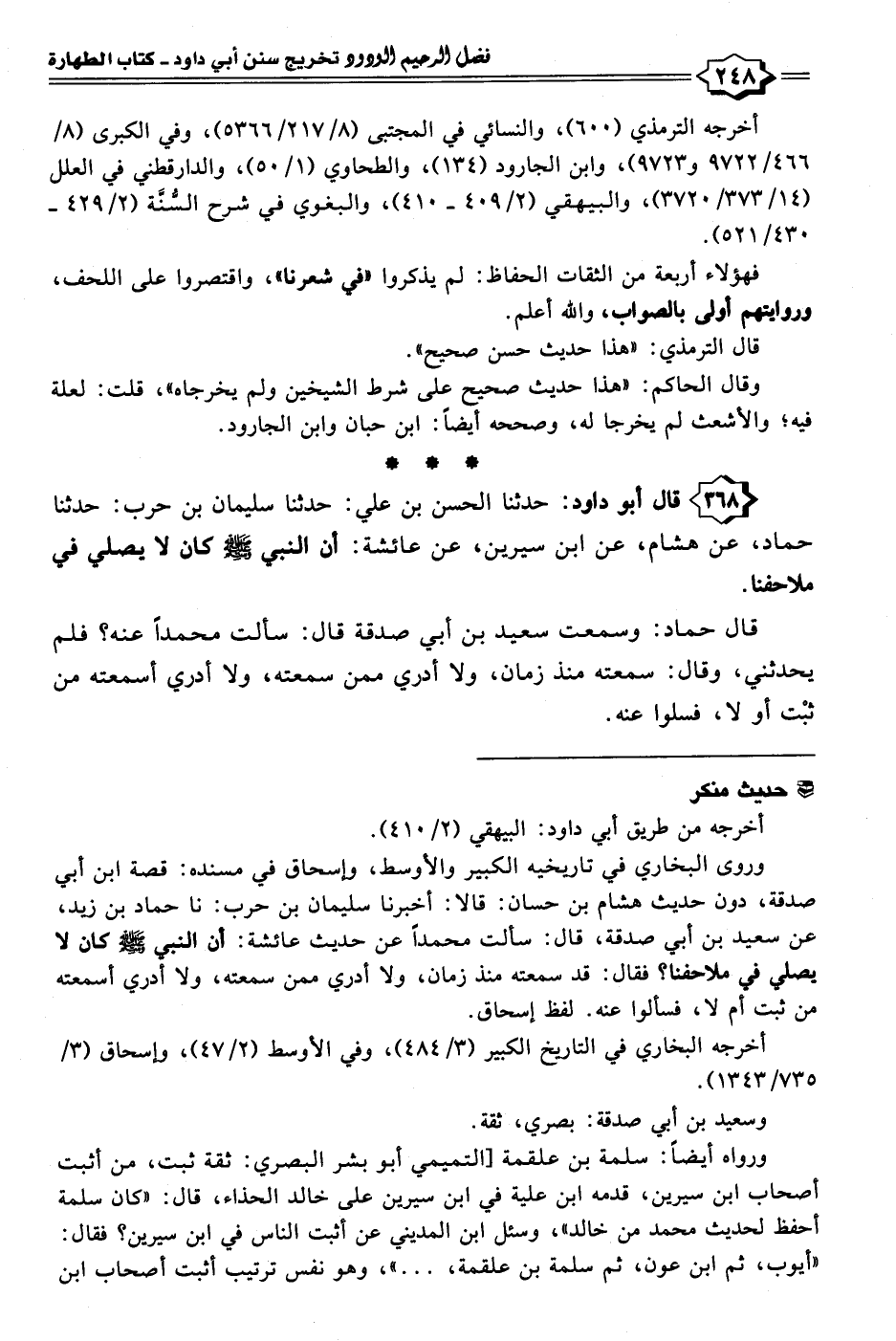 ٣٦٨ - قال أبو داود: حدثنا الحسن بن علي: حدثنا سليمان بن حرب: حدثنا حماد، عن هشام، عن ابن سيرين، عن عائشة: أن النبي - صلى الله عليه وسلم - كان لا يصلي في ملاحفنا.