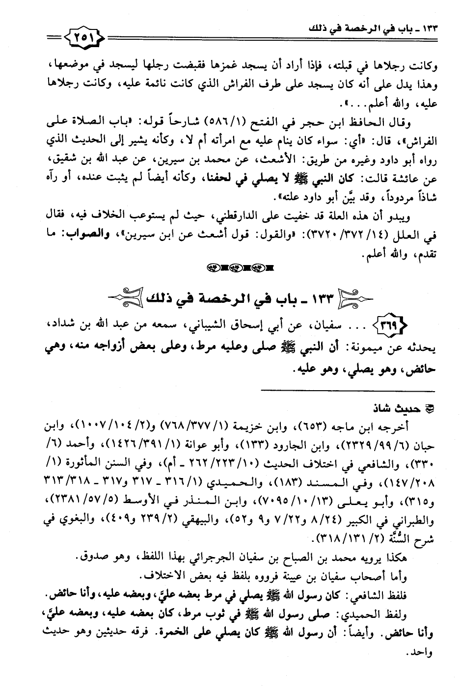 وقال الحافظ ابن حجر في الفتح (١/ ٥٨٦) شارحًا قوله: "باب الصلاة على الفراش"، قال: "أي: سواء كان ينام عليه مع امرأته أم لا، وكأنه يشير إلى الحديث الذي رواه أبو داود وغيره من طريق: الأشعث، عن محمد بن سيرين، عن عبد الله بن شقيق، عن عائشة قالت: كان النبي - صلى الله عليه وسلم - لا يصلي في لحفنا، وكأنه أيضًا لم يثبت عنده، أو رآه شاذًا مردودًا، وقد بيَّن أبو داود علته".