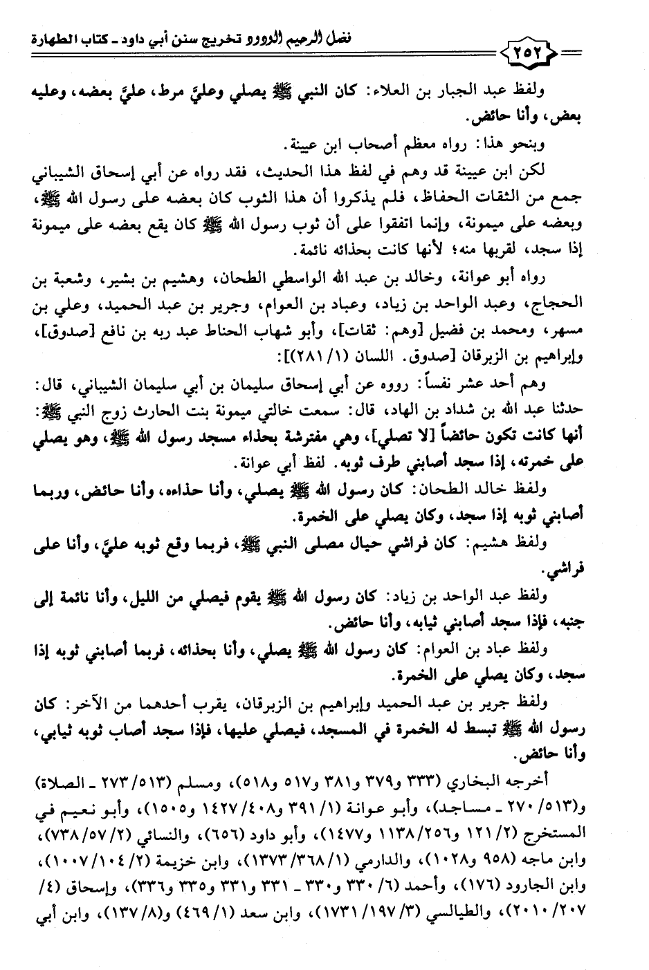 ولفظ عبد الجبار بن العلاء: كان النبي - صلى الله عليه وسلم - يصلي وعليَّ مرط، عليَّ بعضه، وعليه بعض، وأنا حائض.