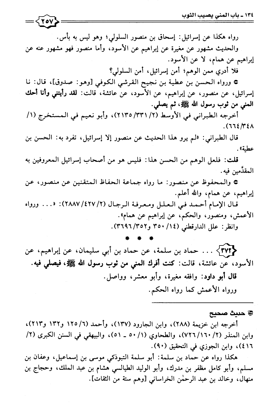 • ورواه الحسن بن عطية بن نجيح القرشي الكوفي [وهو: صدوق]، قال: نا إسرائيل، عن منصور، عن إبراهيم، عن الأسود، عن عائشة، قالت: لقد رأيتني وأنا أحك المني من ثوب رسول الله - صلى الله عليه وسلم -، ثم يصلي.