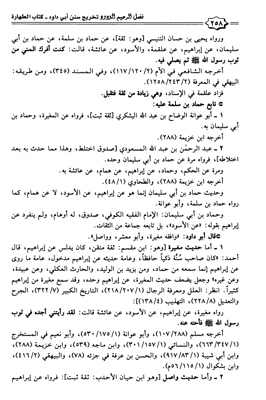ورواه يحيى بن حسان التنيسي [وهو: ثقة]، عن حماد بن سلمة، عن حماد بن أبي سليمان، عن إبراهيم، عن علقمة، والأسود، عن عائشة، قالت: كنت أفرك المني من ثوب رسول الله - صلى الله عليه وسلم - ثم يصلي فيه.