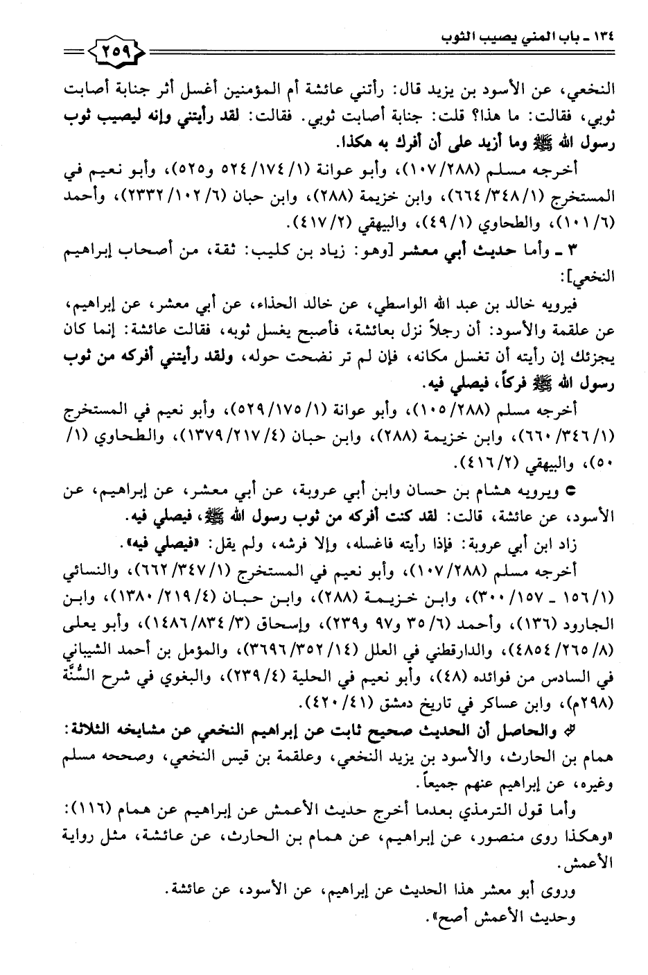 • ويرويه هشام بن حسان وابن أبي عروبة، عن أبي معشر، عن إبراهيم، عن الأسود، عن عائشة، قالت: لقد كنت أفركه من ثوب رسول الله - صلى الله عليه وسلم -، فيصلي فيه.