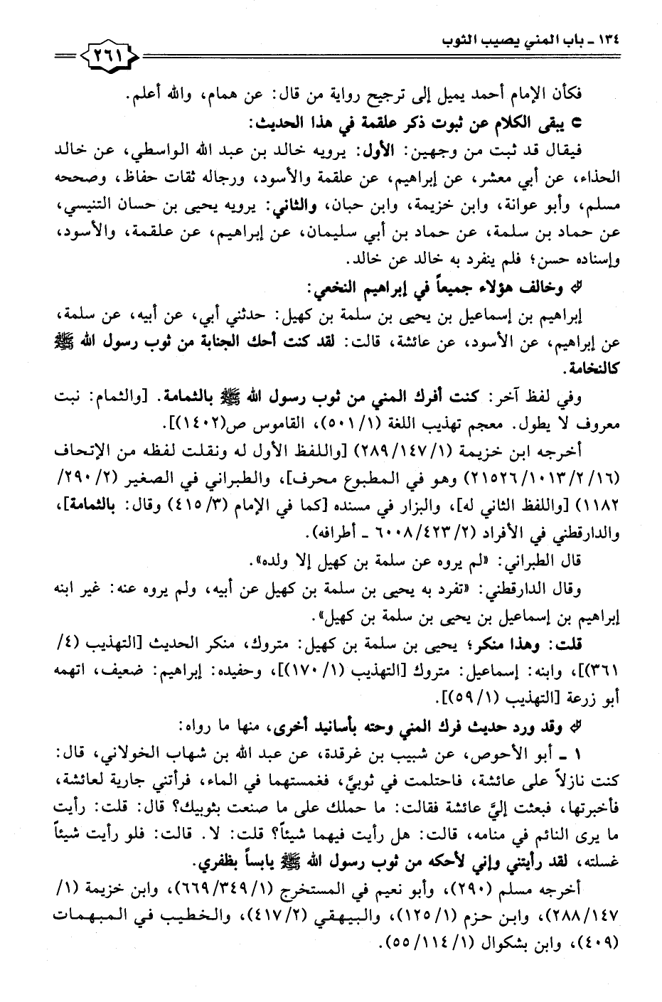١ - أبو الأحوص، عن شبيب بن غرقدة، عن عبد الله بن شهاب الخولاني، قال: كنت نازلًا على عائشة، فاحتلمت في ثوبيَّ، فغمستهما في الماء، فرأتني جارية لعائشة، فأخبرتها، فبعثت إليَّ عائشة فقالت: ما حملك على ما صنعت بثوبيك؟ قال: قلت: رأيت ما يرى النائم في منامه، قالت: هل رأيت فيهما شيئًا؟ قلت: لا. قالت: فلو رأيت شيئًا غسلته، لقد رأيتني وإني لأحكه من ثوب رسول الله - صلى الله عليه وسلم - يابسًا بظفري.