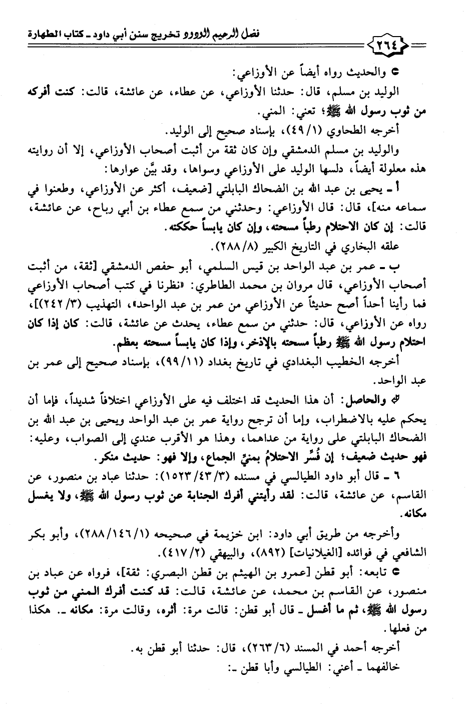 أ- يحيى بن عبد الله بن الضحاك البابلتي [ضعيف، أكثر عن الأوزاعي، وطعنوا في سماعه منه]، قال: قال الأوزاعي: وحدثني من سمع عطاء بن أبي رباح، عن عائشة، قالت: إن كان الاحتلام رطبًا مسحته، وإن كان يابسًا حككته.