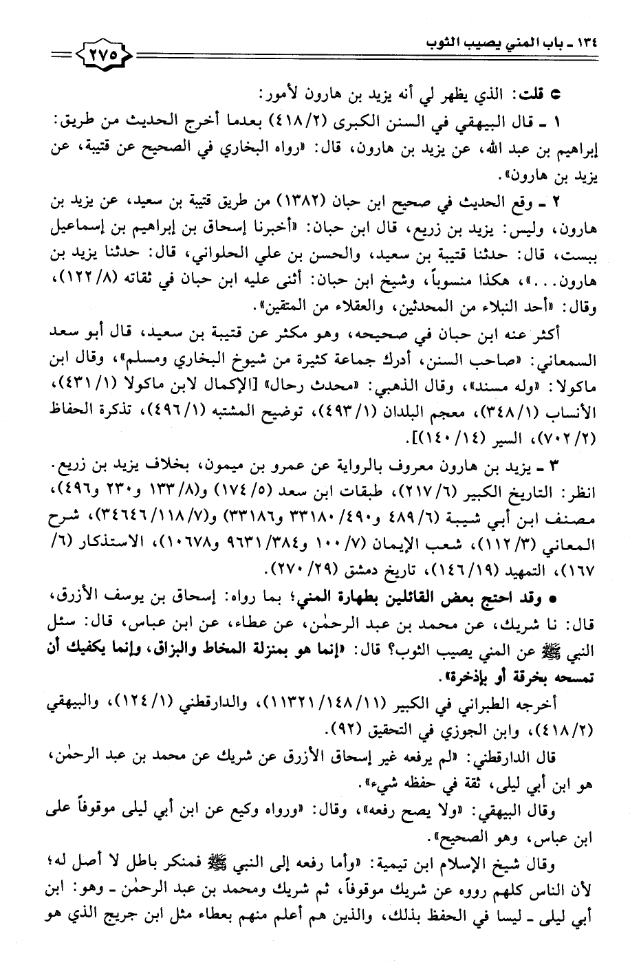 • وقد احتج بعض القائلين بطهارة المني؛ بما رواه: إسحاق بن يوسف الأزرق، قال: نا شريك، عن محمد بن عبد الرحمن، عن عطاء، عن ابن عباس، قال: سئل النبي - صلى الله عليه وسلم - عن المني يصيب الثوب؟ قال: "إنما هو بمنزلة المخاط والبزاق، وإنما يكفيك أن تمسحه بخرقة أو بإذخرة".