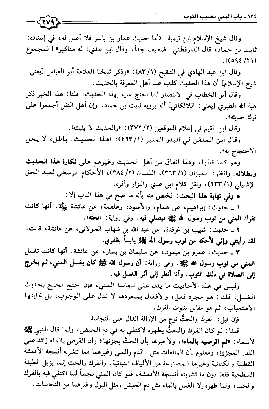 قلنا: لو كان الفرك والحتُّ يطهره لاكتفي به في دم الحيض، ولما قال النبي - صلى الله عليه وسلم - لأسماء: "ثم اقرصيه بالماء"، ولأخبرها بأن الحتَّ يجزئها؛ وأن القرص بالماء زائد على القدر المجزئ، ومعلوم بأن المائعات مثل: الدم والمني وغيرهما مما تتشربه أنسجة الأقمشة القطنية والكتانية وغيرها المصنوعة من الألياف النباتية، والفرك والحت إنما يزيل الطبقة السطحية فقط دون ما تشربته أنسجة الأقمشة، فلو كان المني نجسًا لما اكتفي فيه بالفرك والحت، ولما طهره إلا الغسل بالماء مثل دم الحيض ومثل البول وغيرهما من النجاسات.
