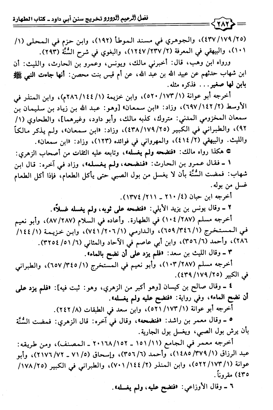 ١ - فقال عمرو بن الحارث: "فنضحه، ولم يغسله"، وزاد في آخره: قال ابن شهاب: فمضت السُّنَّة بأن لا يغسل من بول الصبي حتى يأكل الطعام، فإذا أكل الطعام غسل من بوله.