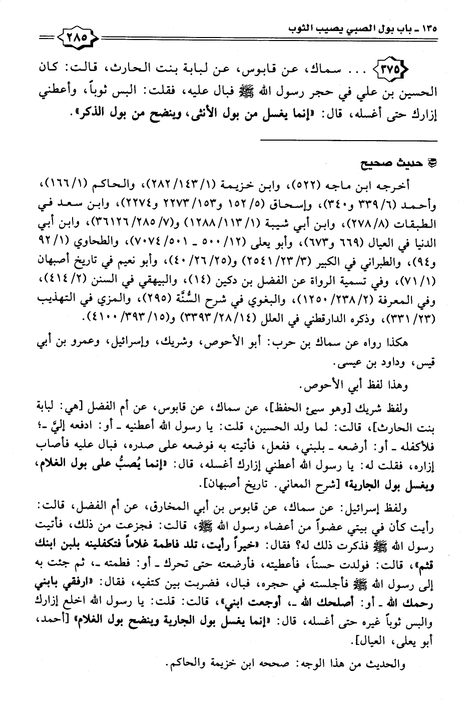 ٣٧٥ - . . . سماك، عن قابوس، عن لبابة بنت الحارث، قالت: كان الحسين بن علي في حجر رسول الله - صلى الله عليه وسلم - فبال عليه، فقلت: البس ثوبًا، وأعطني إزارك حتى أغسله، قال: "إنما يغسل من بول الأنثى، وينضح من بول الذكر".
