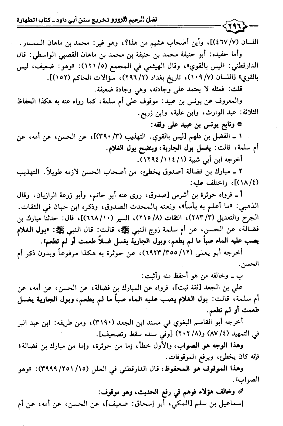 ١ - الفضل بن دلهم [ليس بالقوي. التهذيب (٣/ ٣٩٠)]، عن الحسن، عن أمه، عن أم سلمة، قالت: يغسل بول الجارية، وينضح بول الغلام.