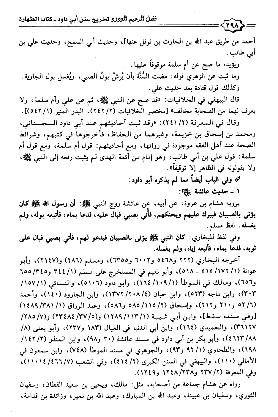 يرويه هشام بن عروة، عن أبيه، عن عائشة زوج النبي - صلى الله عليه وسلم -: أن رسول الله - صلى الله عليه وسلم - كان يؤتى بالصبيان فيبرك عليهم ويحنكهم، فأُتي بصبي فبال عليه، فدعا بماء، فأتبعه بوله، ولم يغسله. لفظ مسلم.