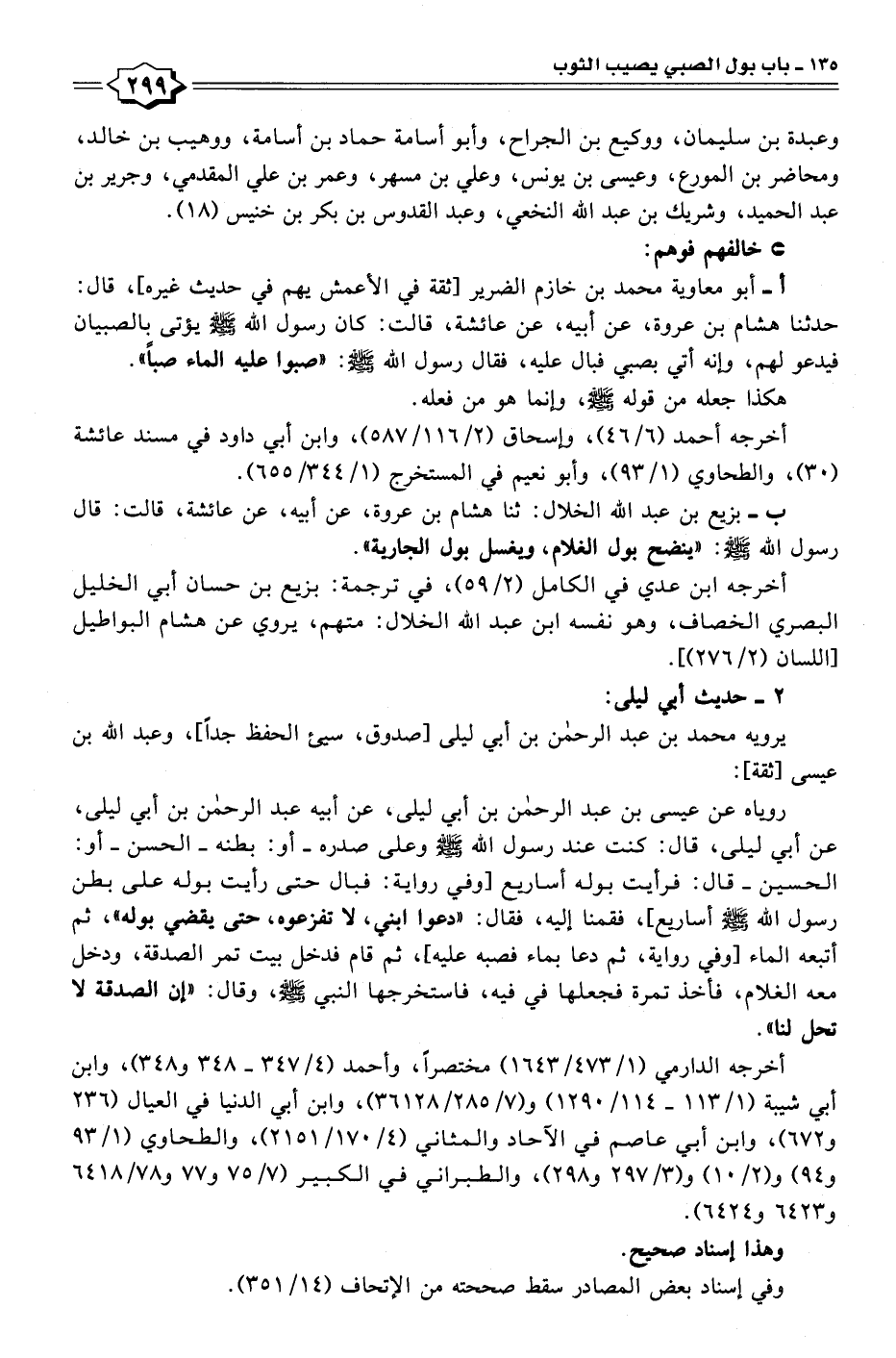 أ- أبو معاوية محمد بن خازم الضرير [ثقة في الأعمش يهم في حديث غيره]، قال: حدثنا هشام بن عروة، عن أبيه، عن عائشة، قالت: كان رسول الله - صلى الله عليه وسلم - يؤتى بالصبيان فيدعو لهم، وإنه أتي بصبي فبال عليه، فقال رسول الله - صلى الله عليه وسلم -: "صبوا عليه الماء صبًا".