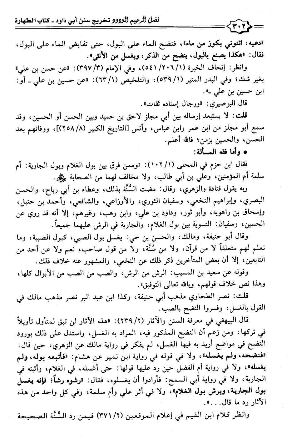 قال البيهقي في معرفة السنن والآثار (٢/ ٢٣٩): "هذه الآثار لن تبق لمتأول تأويلًا في تركها، ومن زعم أن النضح المذكور فيه، المراد به الغسل، واستدل على ذلك بورود النضح في مواضع أريد به فيها الغسل، لم يفكر في رواية مالك عن الزهري، حين قال: "فنضحه، ولم يغسله"، ولا في قوله في رواية ابن نمير عن هشام: "فأتبعه بوله، ولم يغسله"، ولا في رواية أم الفضل حين رد عليها قولها: حتى أغسله، في الغلام، وأثبته في الجارية، ولا في رواية أبي السمح: فأرادوا أن يغسلوه، فقال: "رشوه رشًا؛ فإنه يغسل بول الجارية، ويرش بول الغلام"، ولا في أثر علي وأم سلمة، وفي كل واحد من هذه الآثار رد ما قال ... ".