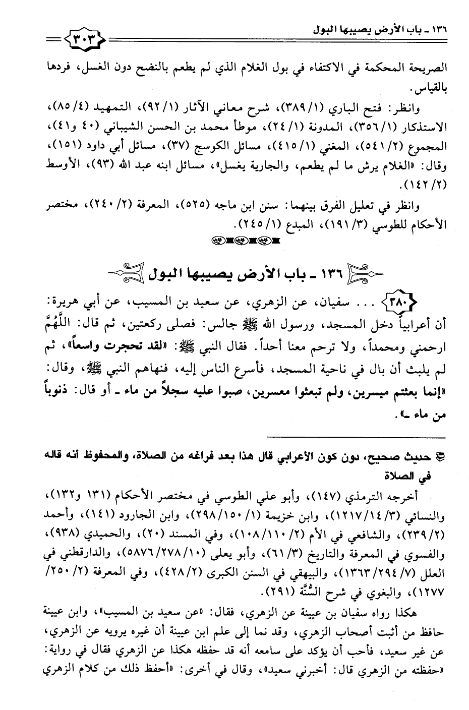 ٣٨٠ - . . . سفيان، عن الزهري، عن سعيد بن المسيب، عن أبي هريرة: أن أعرابيًّا دخل المسجد، ورسول الله - صلى الله عليه وسلم - جالس: فصلى ركعتين، ثم قال: اللَّهُمَّ ارحمني ومحمدًا، ولا ترحم معنا أحدًا. فقال النبي - صلى الله عليه وسلم -: "لقد تحجرت واسعًا"، ثم لم يلبث أن بال في ناحية المسجد، فأسرع الناس إليه، فنهاهم النبي - صلى الله عليه وسلم -، وقال: "إنما بعثتم ميسرين، ولم تبعثوا معسرين، صبوا عليه سجلًا من ماء -أو قال: ذنوبًا من ماء-".