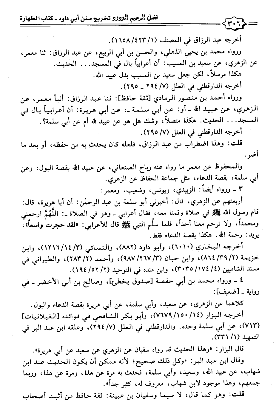 ورواه أحمد بن منصور الرمادي [ثقة حافظ]: ثنا عبد الرزاق: أنبأ معمر، عن الزهري، عن عبيد الله -أو: عن أبي سلمة-، عن أبي هريرة: أن أعرابيًّا بال في المسجد ... الحديث. هكذا متصلًا، وشك هل هو عن عبيد لله أم عن أبي سلمة؟.